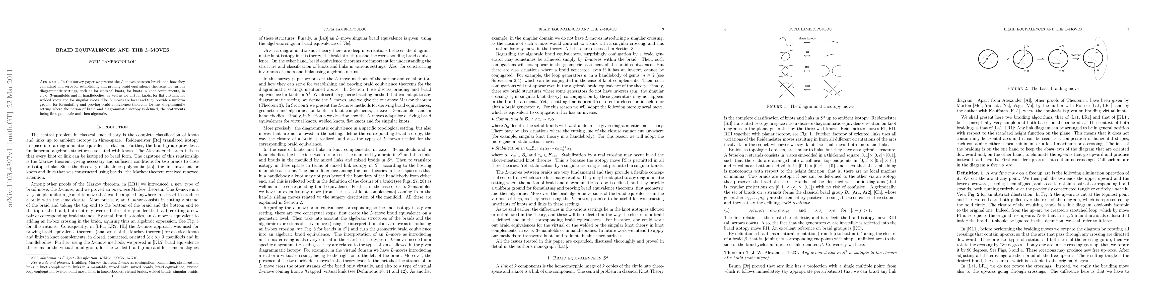 This paper surveys $L$--moves between braids, which serve as a uniform method for establishing braid equivalence theorems across various diagrammatic settings, including classical knots, virtual knots, and singular knots. The $L$--moves provide a geometric and algebraic foundation for proving braid equivalence in different contexts.