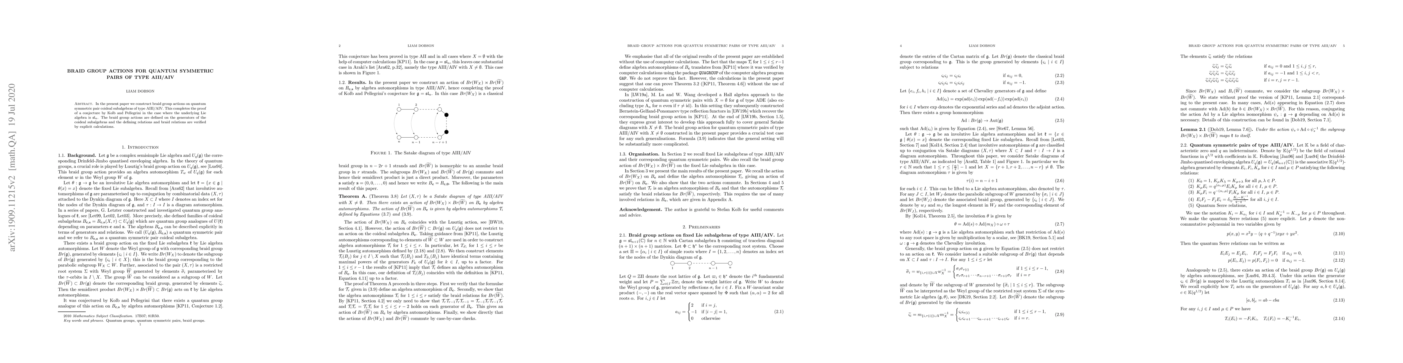 This paper constructs braid group actions on quantum symmetric pair coideal subalgebras of type AIII/AIV, verifying relations through explicit calculations and completing a conjecture by Kolb and Pellegrini for $\mathfrak{sl}_n$.