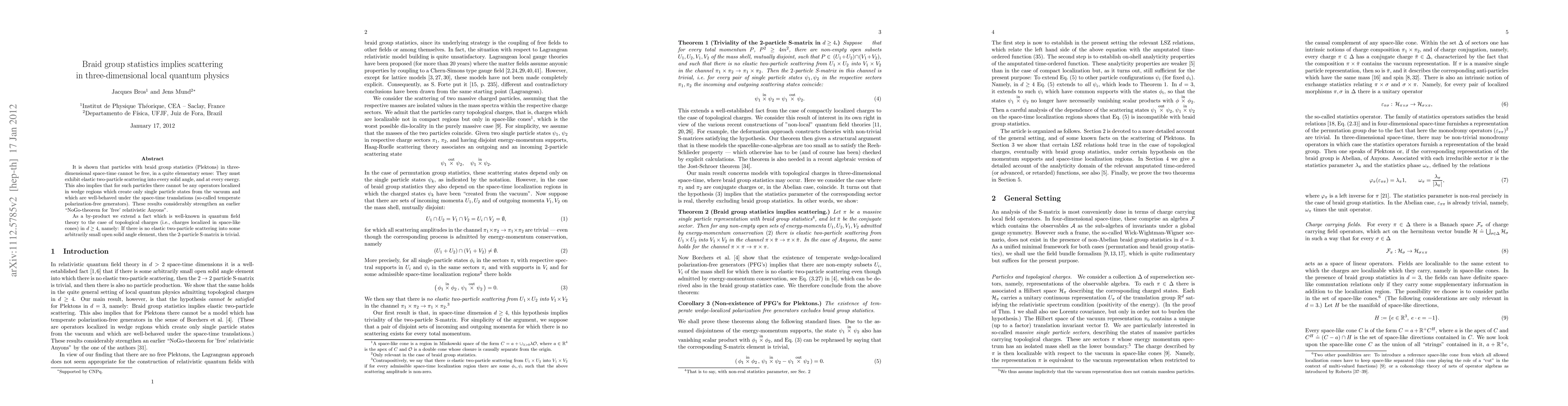 This paper demonstrates that particles with braid group statistics in three-dimensional space-time must exhibit elastic two-particle scattering at all energies, reinforcing a "NoGo-theorem" for 'free' relativistic anyons. It also extends a known quantum field theory result to show that the absence of elastic scattering implies a trivial 2-particle S-matrix for topological charges in higher dimensions.