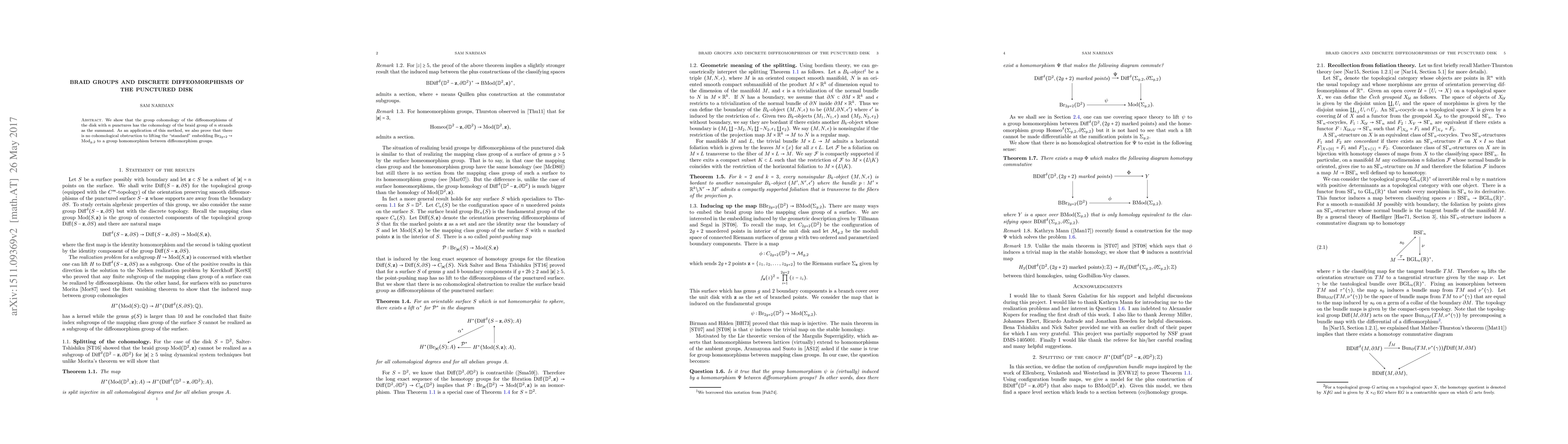 This paper demonstrates that the cohomology of the diffeomorphism group of a disk with $n$ punctures shares a summand with the braid group of $n$ strands. It also proves the absence of cohomological obstructions for lifting the standard embedding from braid groups to mapping class groups.