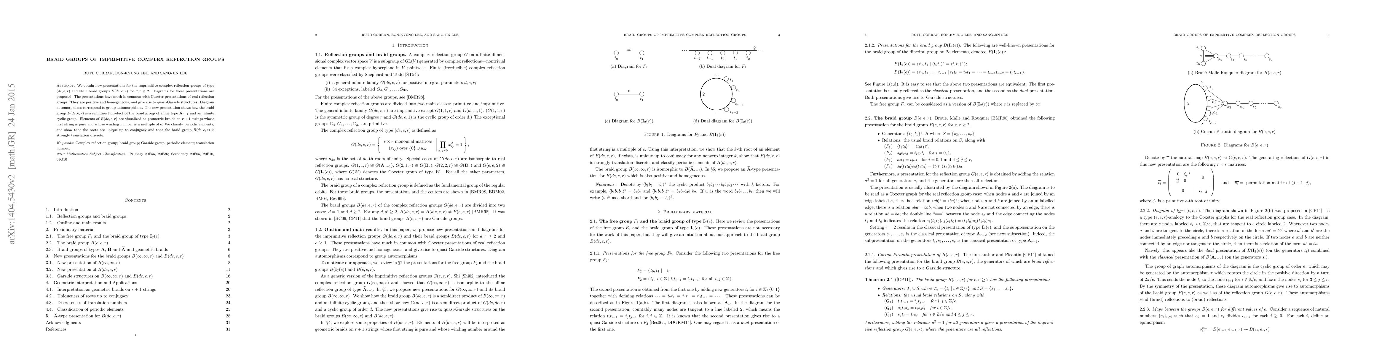 We obtain new presentations for the imprimitive complex reflection groups of type $(de,e,r)$ and their braid groups $B(de,e,r)$ for $d,r \ge 2$. Diagrams for these presentations are proposed. The presentations have much in common with Coxeter presentations of real reflection groups. They are positive and homogeneous, and give rise to quasi-Garside structures. Diagram automorphisms correspond to group automorphisms. The new presentation shows how the braid group $B(de,e,r)$ is a semidirect product of the braid group of affine type $\widetilde A_{r-1}$ and an infinite cyclic group. Elements of $B(de,e,r)$ are visualized as geometric braids on $r+1$ strings whose first string is pure and whose winding number is a multiple of $e$. We classify periodic elements, and show that the roots are unique up to conjugacy and that the braid group $B(de,e,r)$ is strongly translation discrete.