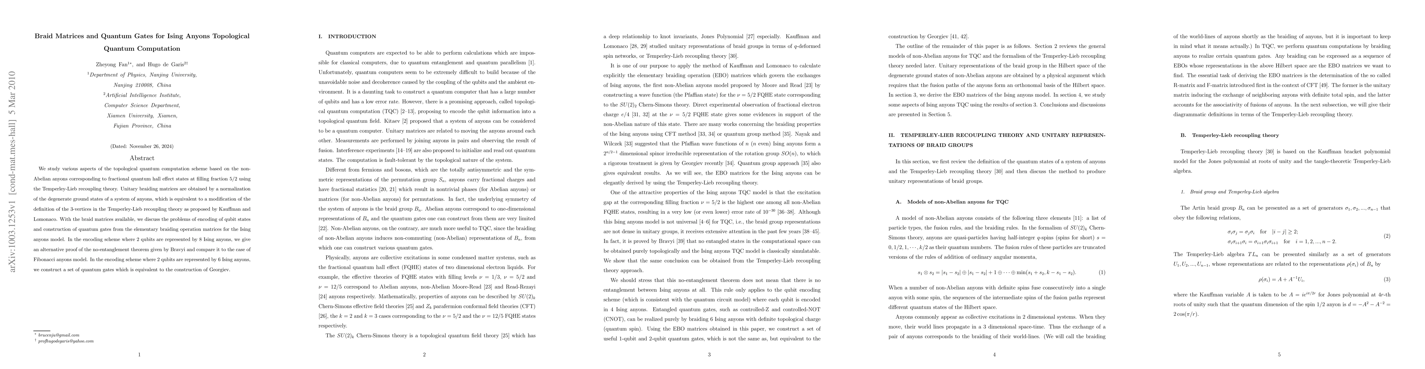 This paper explores the topological quantum computation utilizing Ising anyons, deriving unitary braiding matrices from fractional quantum Hall states. It discusses qubit encoding and quantum gate construction using these matrices, proving the no-entanglement theorem and constructing a set of quantum gates for 6 Ising anyons.