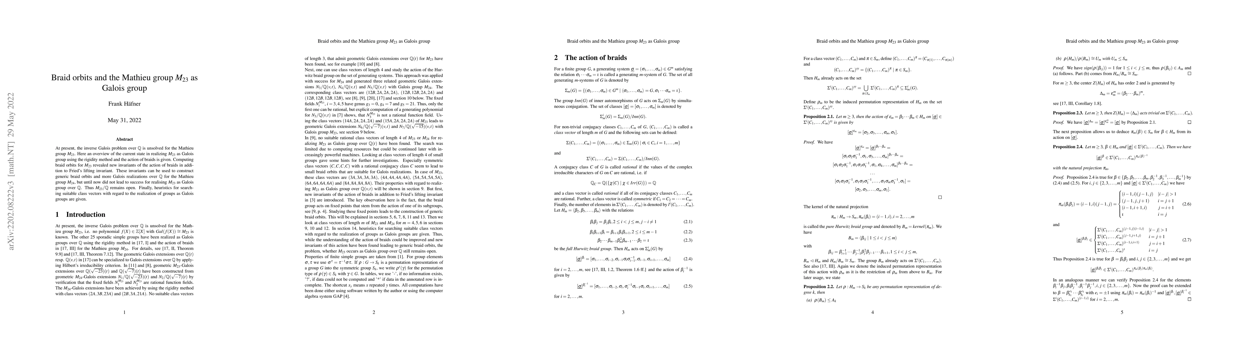 At present, the inverse Galois problem over $\mathbb{Q}$ is unsolved for the Mathieu group $M_{23}$. Here an overview of the current state in realizing $M_{23}$ as Galois group using the rigidity method and the action of braids is given. Computing braid orbits for $M_{23}$ revealed new invariants of the action of braids in addition to Fried's lifting invariant. These invariants can be used to construct generic braid orbits and more Galois realizations over $\mathbb{Q}$ for the Mathieu group $M_{24}$, but until now did not lead to success for realising $M_{23}$ as Galois group over $\mathbb{Q}$. Thus $M_{23}/\mathbb{Q}$ remains open. Finally, heuristics for searching suitable class vectors with regard to the realization of groups as Galois groups are given.