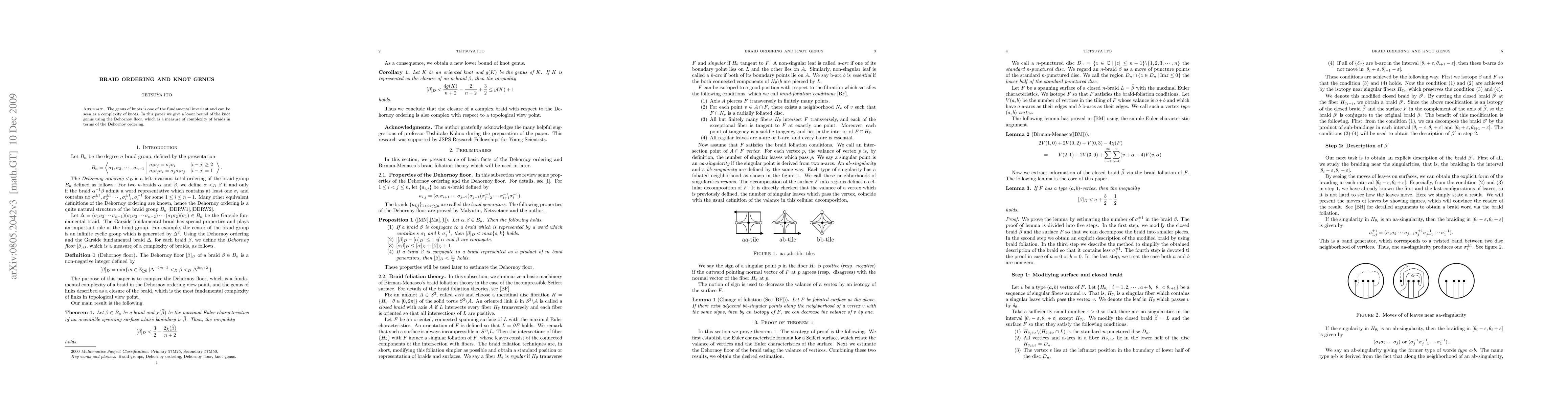 Summary: This paper establishes a lower bound for the genus of knots based on the Dehornoy floor, a complexity measure derived from braid ordering, thereby linking braid complexity to knot complexity.