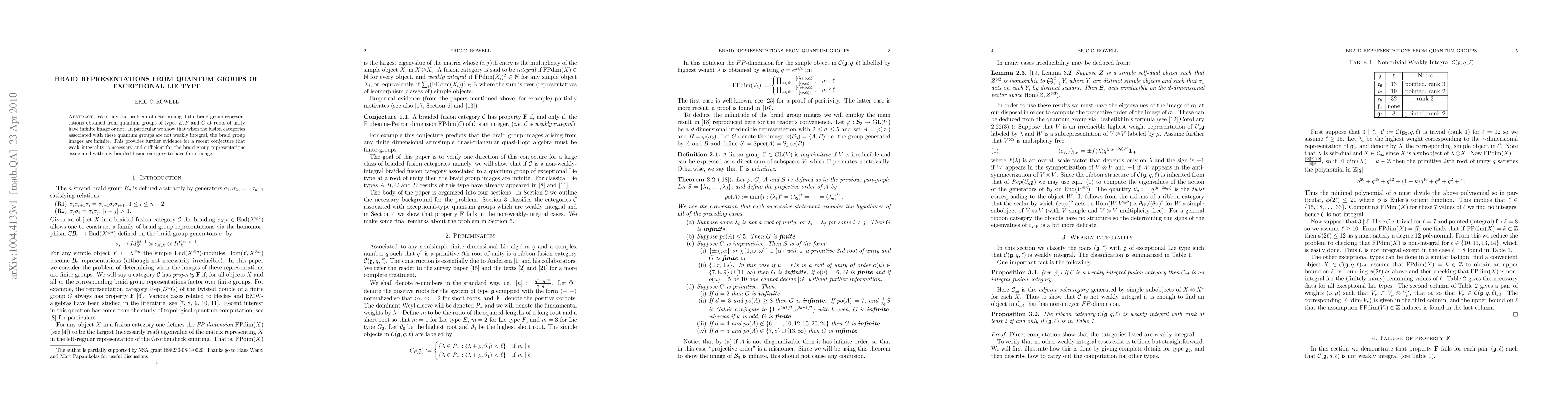 This research investigates braid group representations derived from quantum groups of exceptional Lie types $E, F,$ and $G$ at roots of unity, showing that non-weakly integral fusion categories lead to infinite braid group images, supporting the conjecture that weak integrality is necessary for finite braid group representations.