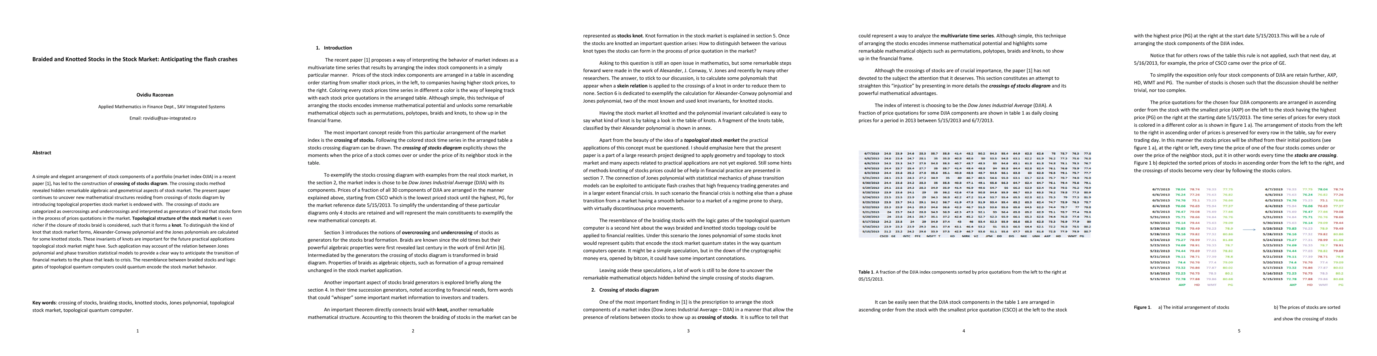 The research introduces a topological approach to the stock market using braids and knots formed by stock price quotations. Crossings of stocks are categorized as overcrossings and undercrossings, forming braid generators that 'write words' providing insights into market state. Braids are closed to form knots, which are classified using Alexander-Conway and Jones polynomials.