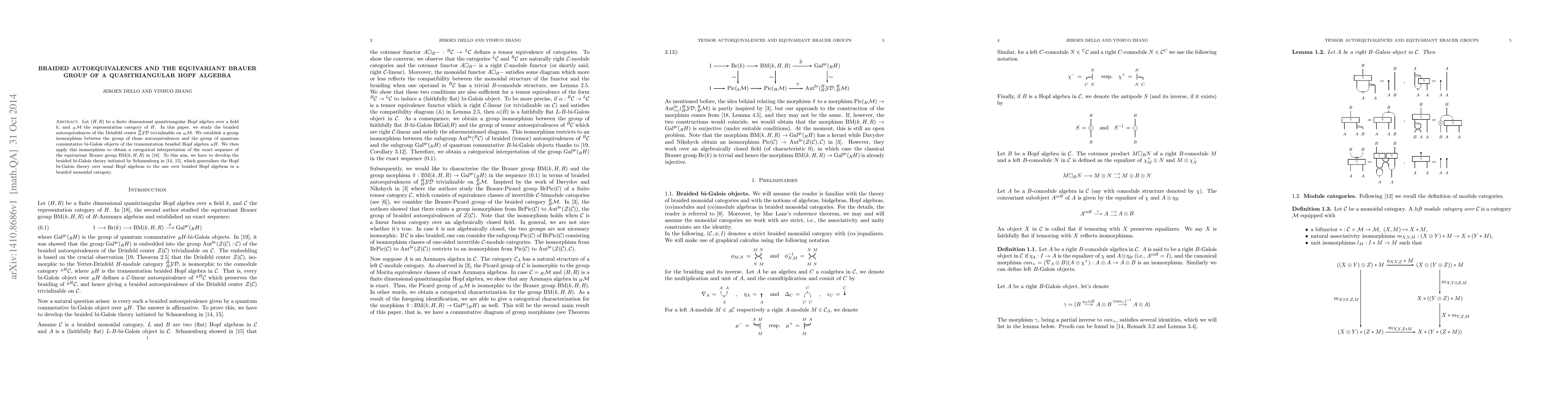 Let $(H, R)$ be a finite dimensional quasitriangular Hopf algebra over a field $k$, and $_H\mathcal{M}$ the representation category of $H$. In this paper, we study the braided autoequivalences of the Drinfeld center $^H_H\mathcal{YD}$ trivializable on $_H\mathcal{M}$. We establish a group isomorphism between the group of those autoequivalences and the group of quantum commutative bi-Galois objects of the transmutation braided Hopf algebra $_RH$. We then apply this isomorphism to obtain a categorical interpretation of the exact sequence of the equivariant Brauer group $\mathrm{BM}(k, H,R)$ in [18]. To this aim, we have to develop the braided bi-Galois theory initiated by Schauenburg in [14,15], which generalizes the Hopf bi-Galois theory over usual Hopf algebras to the one over braided Hopf algebras in a braided monoidal category.