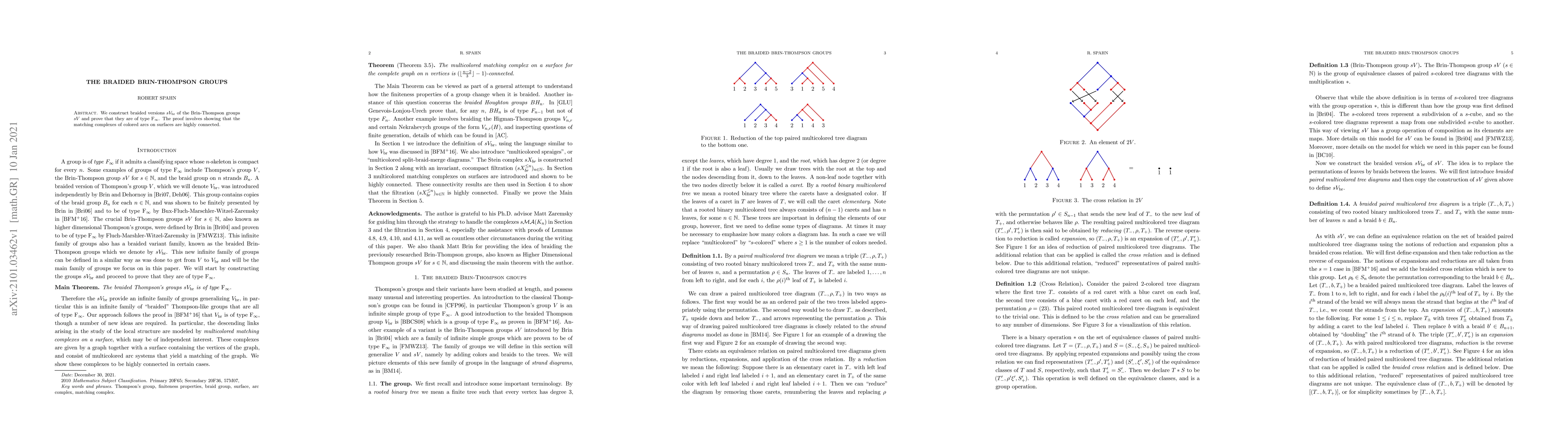 We construct braided versions $sV_{br}$ of the Brin-Thompson groups $sV$ and prove that they are of type $F_\infty$. The proof involves showing that the matching complexes of colored arcs on surfaces are highly connected.
