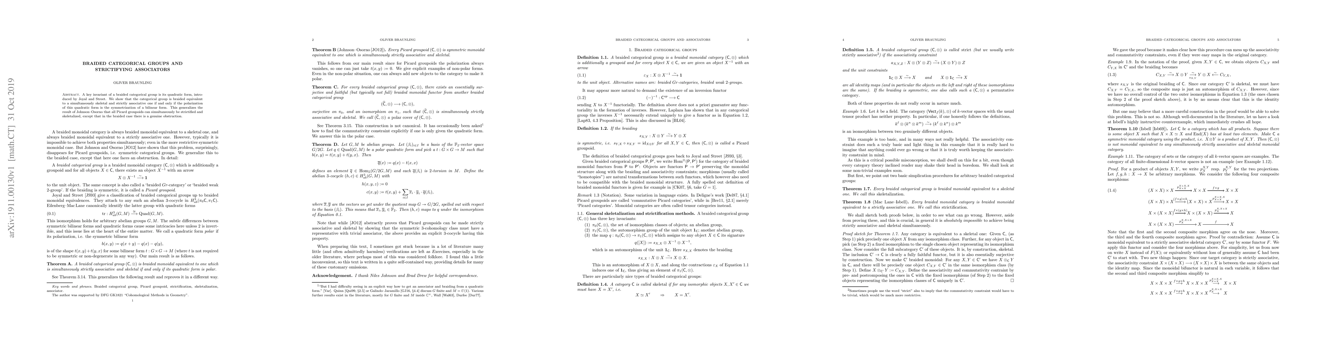 This paper demonstrates that a braided categorical group can be strictly associative and skeletal if and only if its quadratic form's polarization aligns with the symmetrization of a bilinear form. This extends the Johnson-Osorno result for Picard groupoids, introducing a specific obstruction in the braided context.