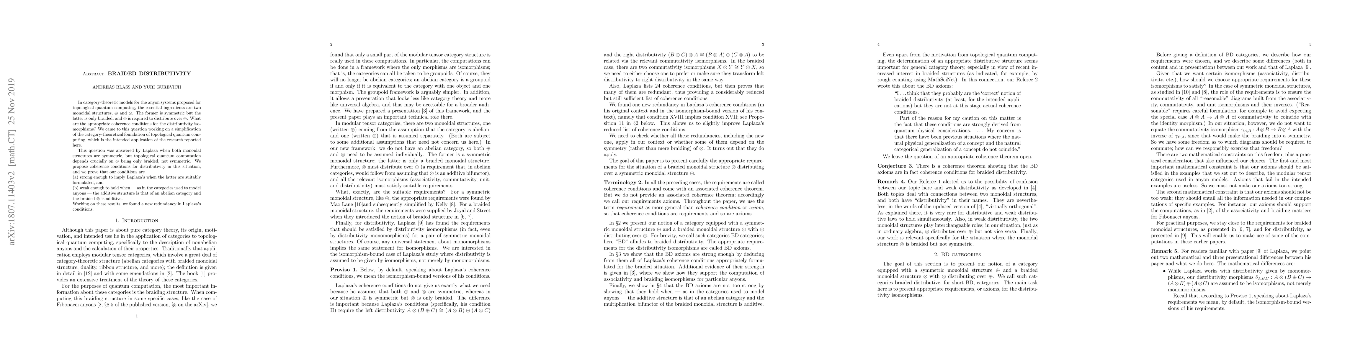 In category-theoretic models for the anyon systems proposed for topological quantum computing, the essential ingredients are two monoidal structures, $\oplus$ and $\otimes$. The former is symmetric but the latter is only braided, and $\otimes$ is required to distribute over $\oplus$. What are the appropriate coherence conditions for the distributivity isomorphisms? We came to this question working on a simplification of the category-theoretical foundation of topological quantum computing, which is the intended application of the research reported here. This question was answered by Laplaza when both monoidal structures are symmetric, but topological quantum computation depends crucially on $\otimes$ being only braided, not symmetric. We propose coherence conditions for distributivity in this situation, and we prove that our conditions are (a) strong enough to imply Laplaza's when the latter are suitably formulated, and (b) weak enough to hold when --- as in the categories used to model anyons --- the additive structure is that of an abelian category and the braided $\otimes$ is additive. Working on these results, we found a new redundancy in Laplaza's conditions.