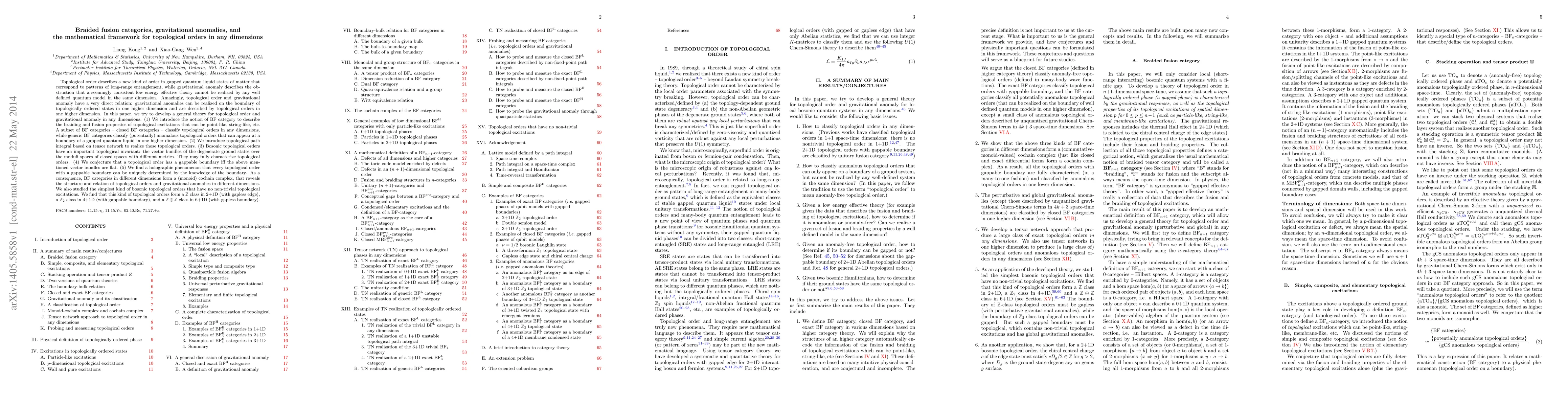 The paper introduces BF categories and their properties to describe topological excitations and their braiding and fusion, providing a mathematical structure for topological orders and gravitational anomalies in any dimensions.