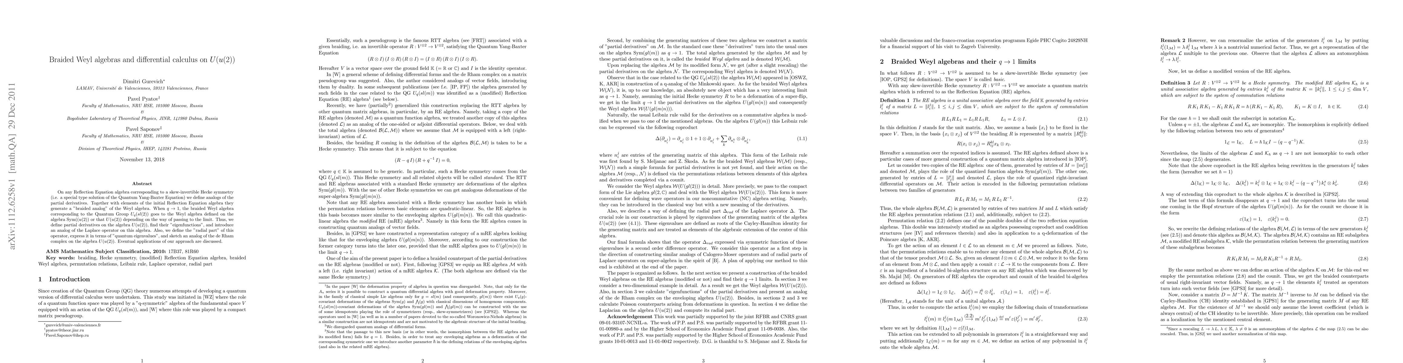 On any Reflection Equation algebra corresponding to a skew-invertible Hecke symmetry (i.e. a special type solution of the Quantum Yang-Baxter Equation) we define analogs of the partial derivatives. Together with elements of the initial Reflection Equation algebra they generate a "braided analog" of the Weyl algebra. When $q\to 1$, the braided Weyl algebra corresponding to the Quantum Group $U_q(sl(2))$ goes to the Weyl algebra defined on the algebra $\Sym((u(2))$ or that $U(u(2))$ depending on the way of passing to the limit. Thus, we define partial derivatives on the algebra $U(u(2))$, find their "eigenfunctions", and introduce an analog of the Laplace operator on this algebra. Also, we define the "radial part" of this operator, express it in terms of "quantum eigenvalues", and sketch an analog of the de Rham complex on the algebra $U(u(2))$. Eventual applications of our approach are discussed.