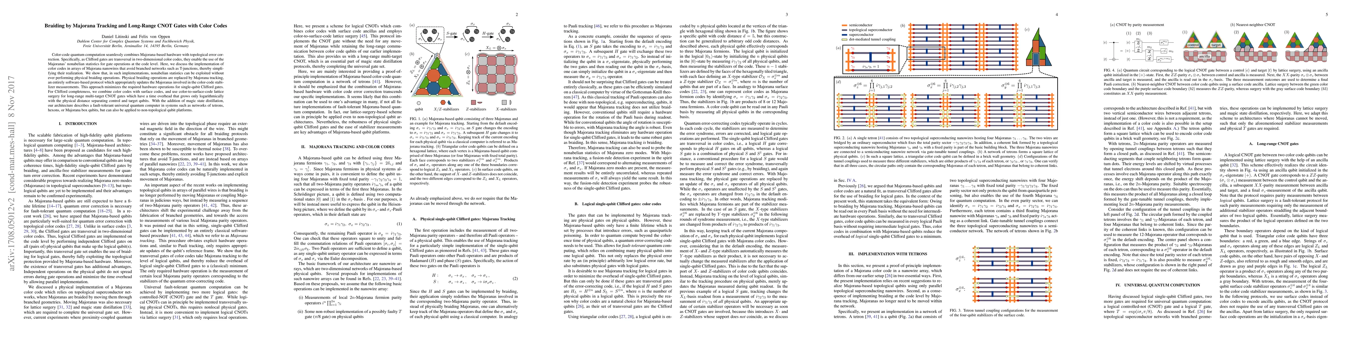 This paper proposes a method for braiding Majorana fermions in color codes using Majorana tracking instead of physical braiding, simplifying hardware operations. It also integrates color codes with surface codes for universal quantum computation, achieving long-range CNOT gates with logarithmic time overhead.