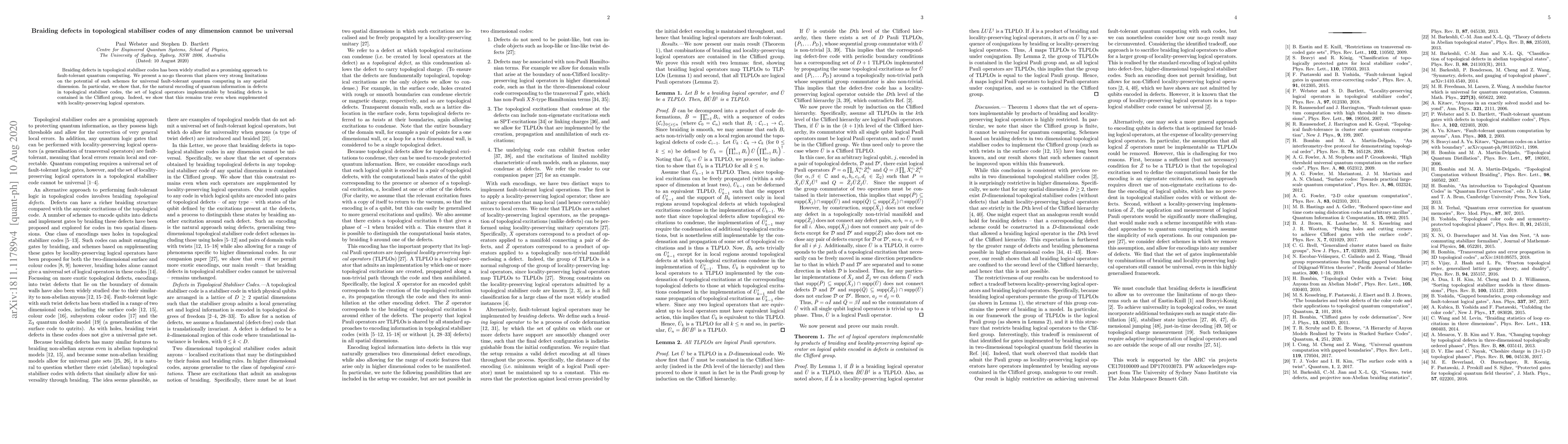 Summary: The study proves a no-go theorem limiting the use of braiding defects in topological stabiliser codes for universal fault-tolerant quantum computing, demonstrating that such schemes inherently restrict logical operations to the Clifford group, even with added locality-preserving operators.