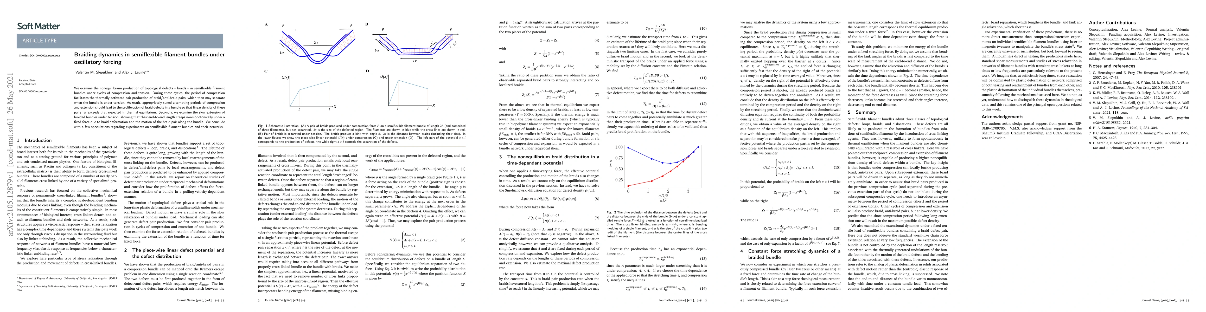 This paper investigates how semiflexible filament bundles generate topological defects, known as braids, under oscillatory compression and tension cycles. The study finds that alternating periods of compression and extension lead to a higher density of braid defects than in thermal equilibrium, and explores the nonmonotonic creep behavior of braided bundles under tension.