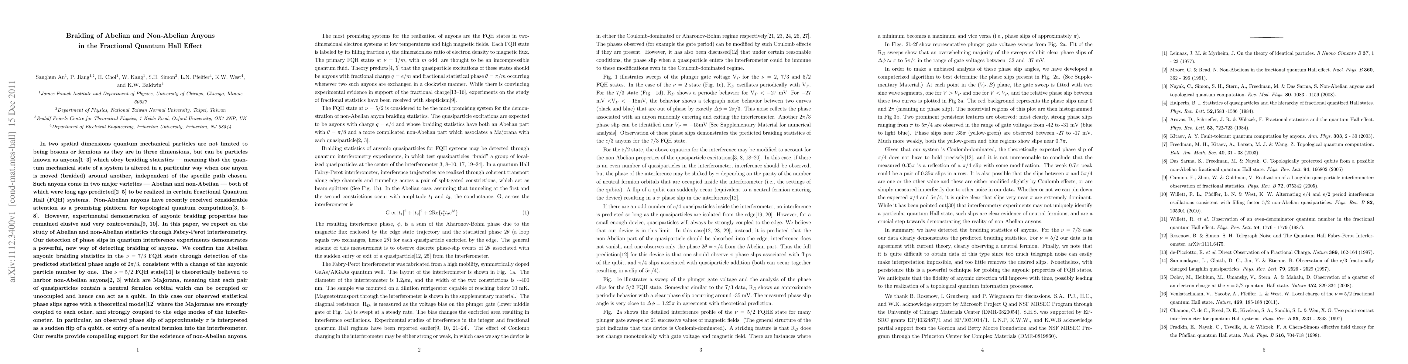 This paper investigates Abelian and non-Abelian anyons in fractional quantum Hall (FQH) systems using Fabry-Perot interferometry, detecting braiding through phase slips. It confirms Abelian anyons in the $\nu = 7/3$ state and provides evidence for non-Abelian anyons in the $\nu = 5/2$ state via observed phase slips corresponding to qubit flips.