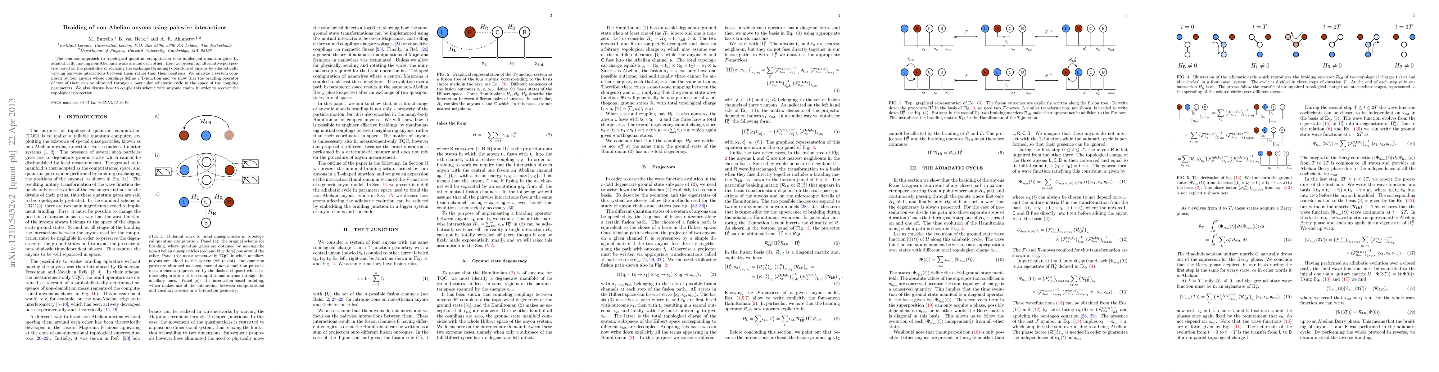 The paper proposes an alternative method for braiding non-Abelian anyons by adiabatically varying pairwise interactions instead of their positions, demonstrating this through a T-junction system and discussing integration with anyonic chains for topological protection.
