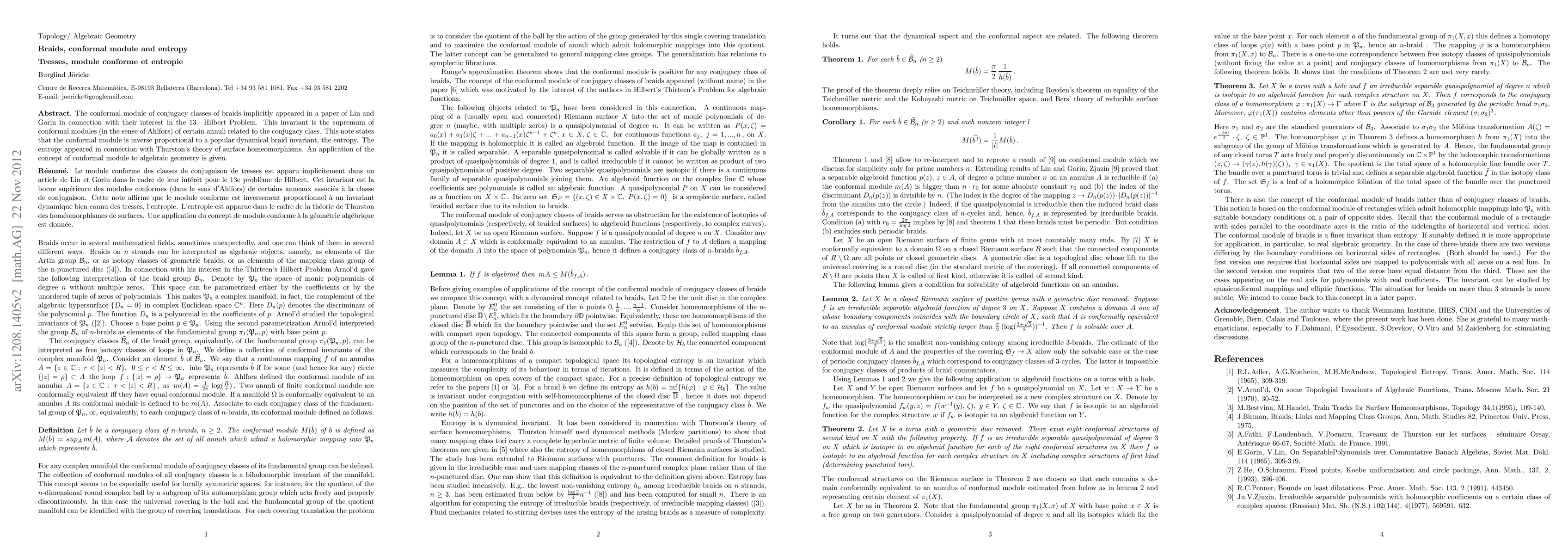 This paper explores the relationship between the conformal module of braids and entropy, showing that the conformal module is inversely proportional to entropy, a dynamical invariant linked to Thurston's surface homeomorphisms. It also applies the concept of conformal module to algebraic geometry.