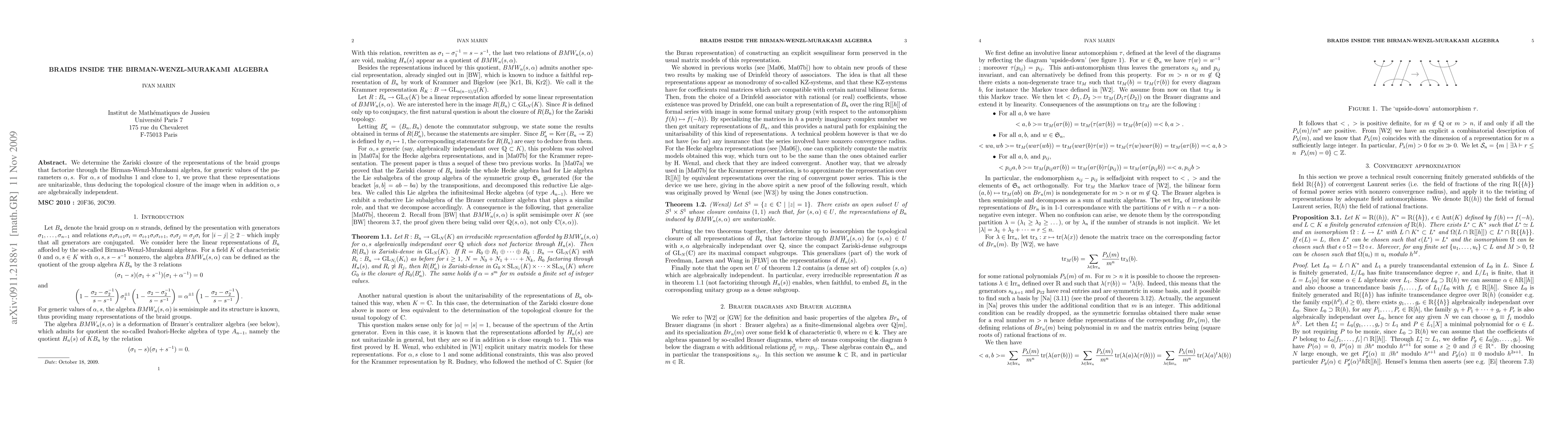 The paper determines the Zariski closure of braid group representations that pass through the Birman-Wenzl-Murakami algebra for generic parameter values. It proves these representations are unitarizable when parameters are close to 1 and algebraically independent, deducing their topological closure.