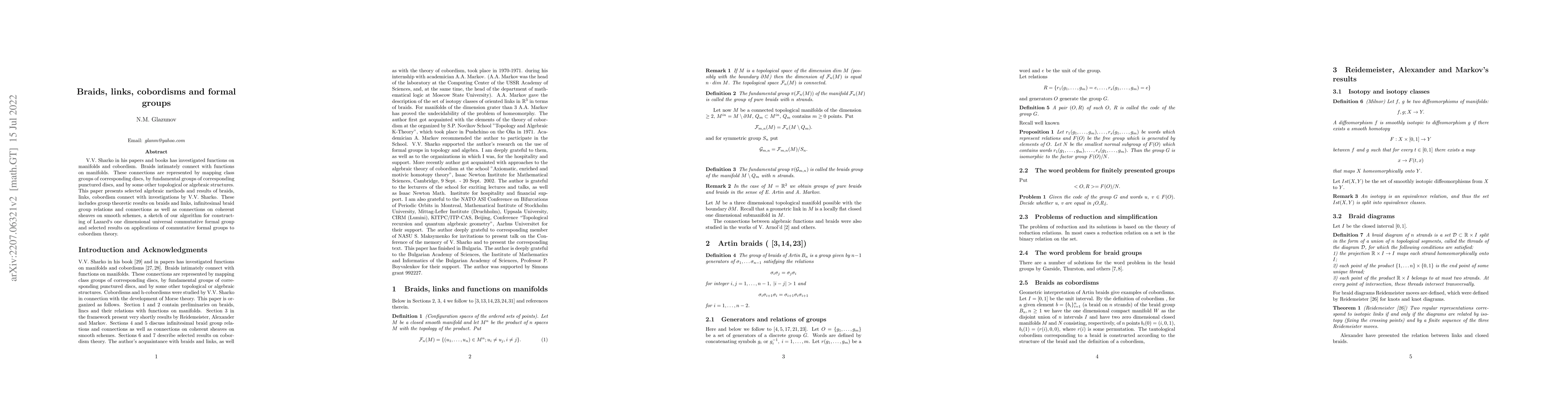 This paper explores algebraic methods and results connecting braids, links, and cobordisms, emphasizing the work of V.V. Sharko. It discusses group-theoretic findings on braids and links, infinitesimal braid group relations, and applications of commutative formal groups to cobordism theory.