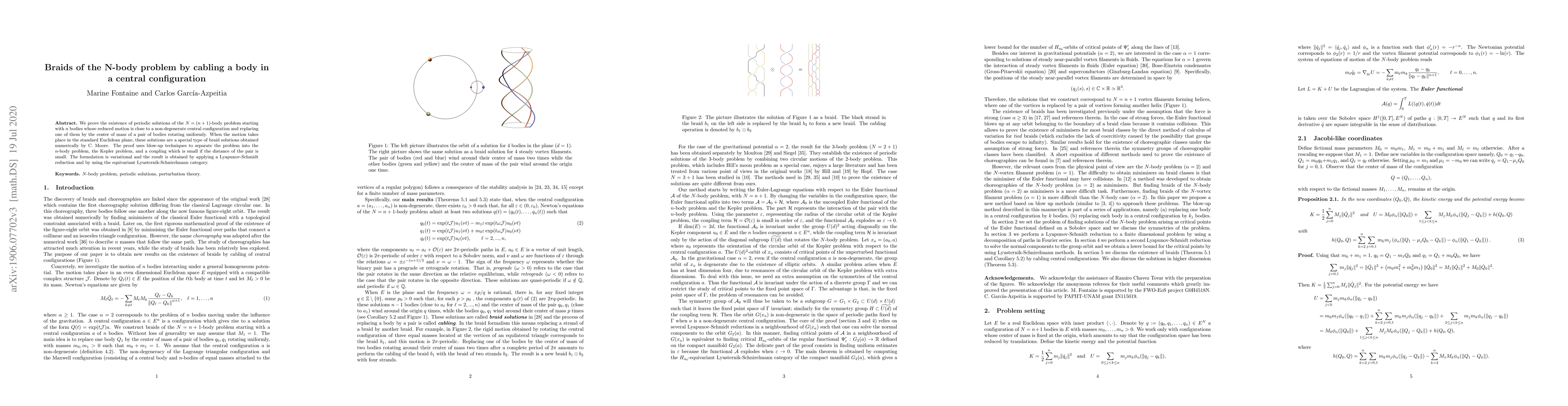 This paper proves the existence of periodic solutions for the N-body problem by transforming n bodies into a configuration where one body is replaced by the center of mass of a pair, leading to braid solutions. The proof employs blow-up techniques, Lyapunov-Schmidt reduction, and equivariant Lyusternik-Schnirelmann category to handle the problem's complexity.