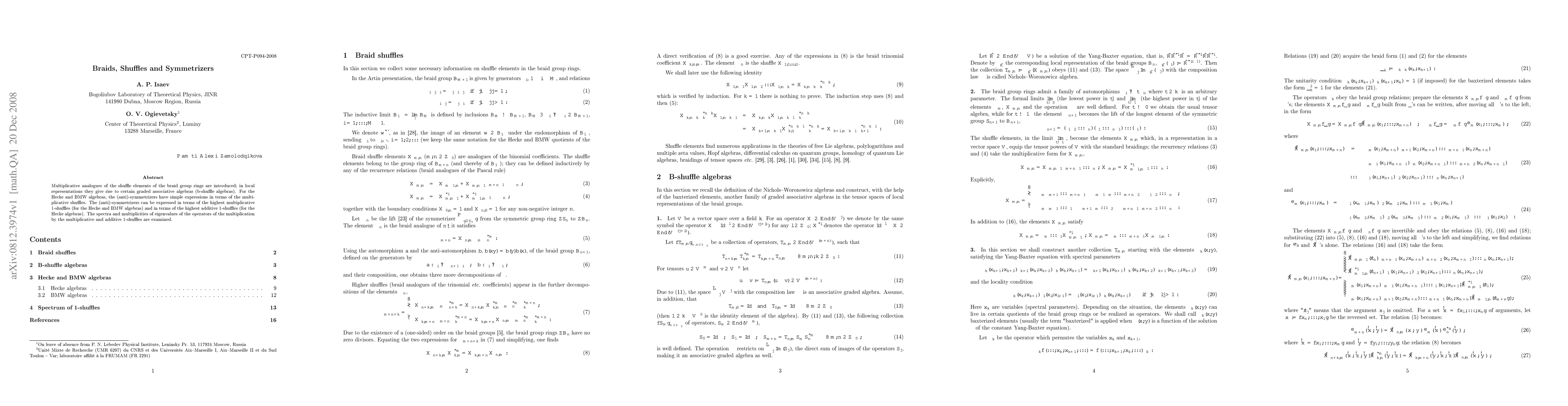Multiplicative analogues of the shuffle elements of the braid group rings are introduced; in local representations they give rise to certain graded associative algebras (b-shuffle algebras). For the Hecke and BMW algebras, the (anti)-symmetrizers have simple expressions in terms of the multiplicative shuffles. The (anti)-symmetrizers can be expressed in terms of the highest multiplicative 1-shuffles (for the Hecke and BMW algebras) and in terms of the highest additive 1-shuffles (for the Hecke algebras). The spectra and multiplicities of eigenvalues of the operators of the multiplication by the multiplicative and additive 1-shuffles are examined.