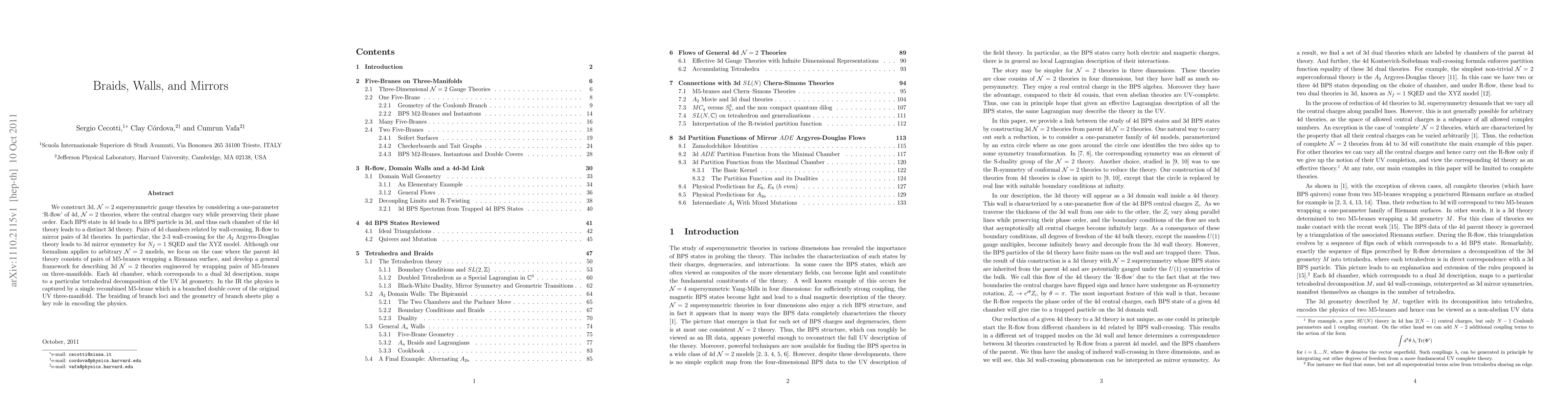 We construct 3d, N=2 supersymmetric gauge theories by considering a one-parameter `R-flow' of 4d, N=2 theories, where the central charges vary while preserving their phase order. Each BPS state in 4d leads to a BPS particle in 3d, and thus each chamber of the 4d theory leads to a distinct 3d theory. Pairs of 4d chambers related by wall-crossing, R-flow to mirror pairs of 3d theories. In particular, the 2-3 wall-crossing for the A_2 Argyres-Douglas theory leads to 3d mirror symmetry for N_f=1 SQED and the XYZ model. Although our formalism applies to arbitrary N=2 models, we focus on the case where the parent 4d theory consists of pairs of M5-branes wrapping a Riemann surface, and develop a general framework for describing 3d N=2 theories engineered by wrapping pairs of M5-branes on three-manifolds. Each 4d chamber, which corresponds to a dual 3d description, maps to a particular tetrahedral decomposition of the UV 3d geometry. In the IR the physics is captured by a single recombined M5-brane which is a branched double cover of the original UV three-manifold. The braiding of branch loci and the geometry of branch sheets play a key role in encoding the physics.