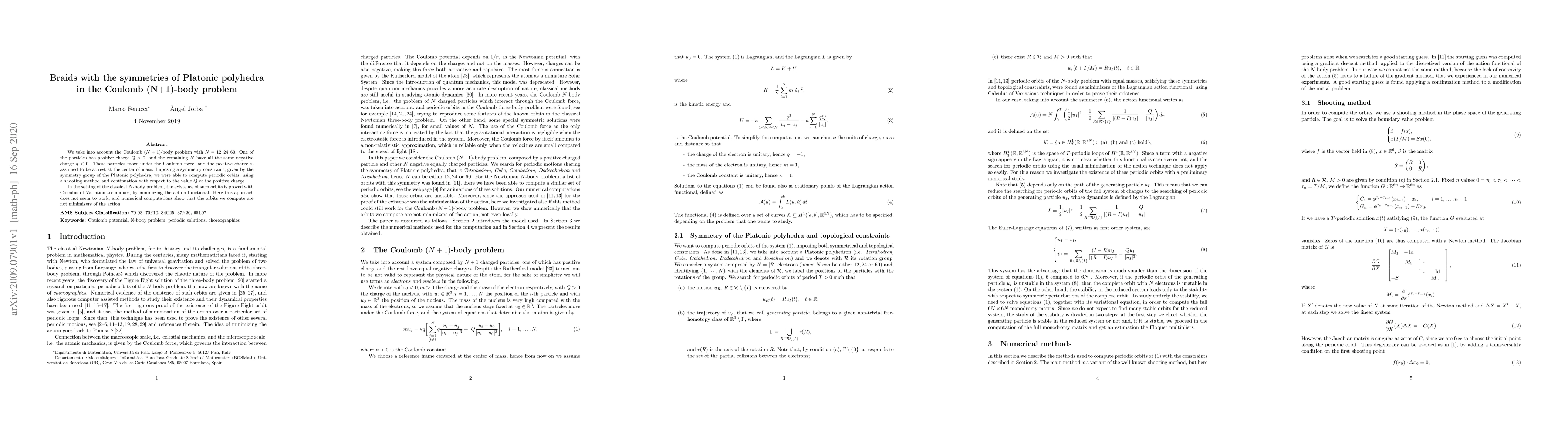 We take into account the Coulomb (N + 1)-body problem with N = 12, 24, 60. One of the particles has positive charge Q > 0, and the remaining N have all the same negative charge q < 0. These particles move under the Coulomb force, and the positive charge is assumed to be at rest at the center of mass. Imposing a symmetry constraint, given by the symmetry group of the Platonic polyhedra, we were able to compute periodic orbits, using a shooting method and continuation with respect to the value Q of the positive charge. In the setting of the classical N -body problem, the existence of such orbits is proved with Calculus of Variation techniques, by minimizing the action functional. Here this approach does not seem to work, and numerical computations show that the orbits we compute are not minimizers of the action.