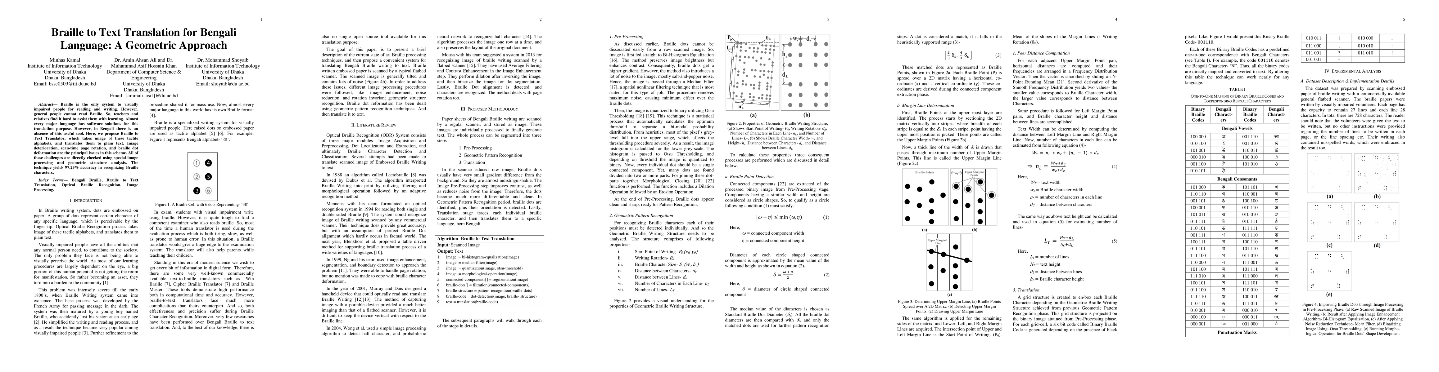 This paper proposes a geometric approach to translate Braille to text for the Bengali language, addressing challenges like image deterioration and deformation. The developed system achieves 97.25% accuracy in recognizing Braille characters, aiming to assist visually impaired individuals by providing a useful translation tool.