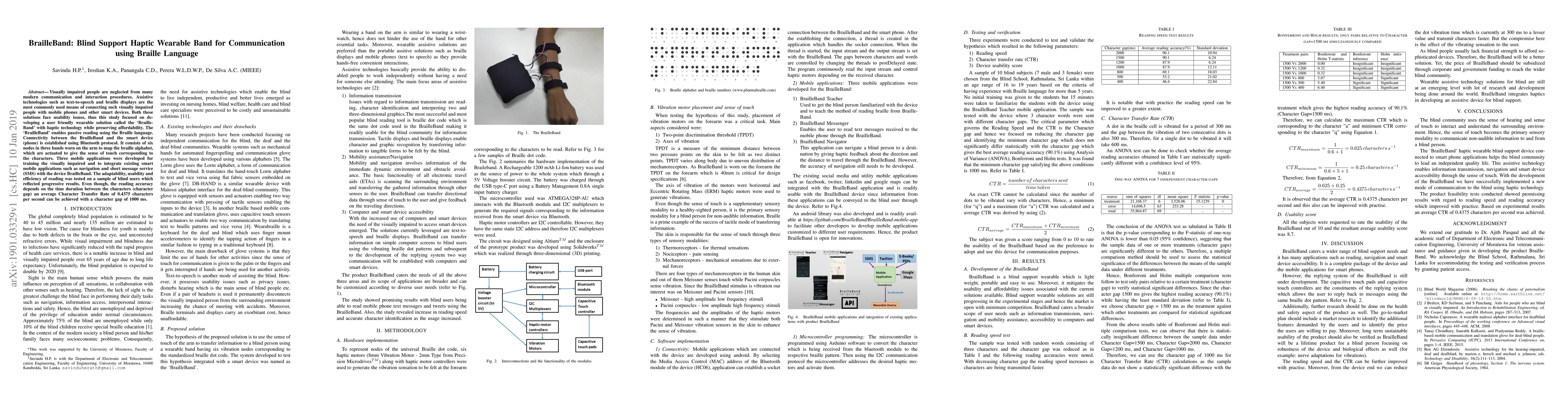 Visually impaired people are neglected from many modern communication and interaction procedures. Assistive technologies such as text-to-speech and braille displays are the most commonly used means of connecting such visually impaired people with mobile phones and other smart devices. Both these solutions face usability issues, thus this study focused on developing a user friendly wearable solution called the "BrailleBand" with haptic technology while preserving affordability. The "BrailleBand" enables passive reading using the Braille language. Connectivity between the BrailleBand and the smart device (phone) is established using Bluetooth protocol. It consists of six nodes in three bands worn on the arm to map the braille alphabet, which are actuated to give the sense of touch corresponding to the characters. Three mobile applications were developed for training the visually impaired and to integrate existing smart mobile applications such as navigation and short message service (SMS) with the device BrailleBand. The adaptability, usability and efficiency of reading was tested on a sample of blind users which reflected progressive results. Even though, the reading accuracy depends on the time duration between the characters (character gap) an average Character Transfer Rate of 0.4375 characters per second can be achieved with a character gap of 1000 ms.