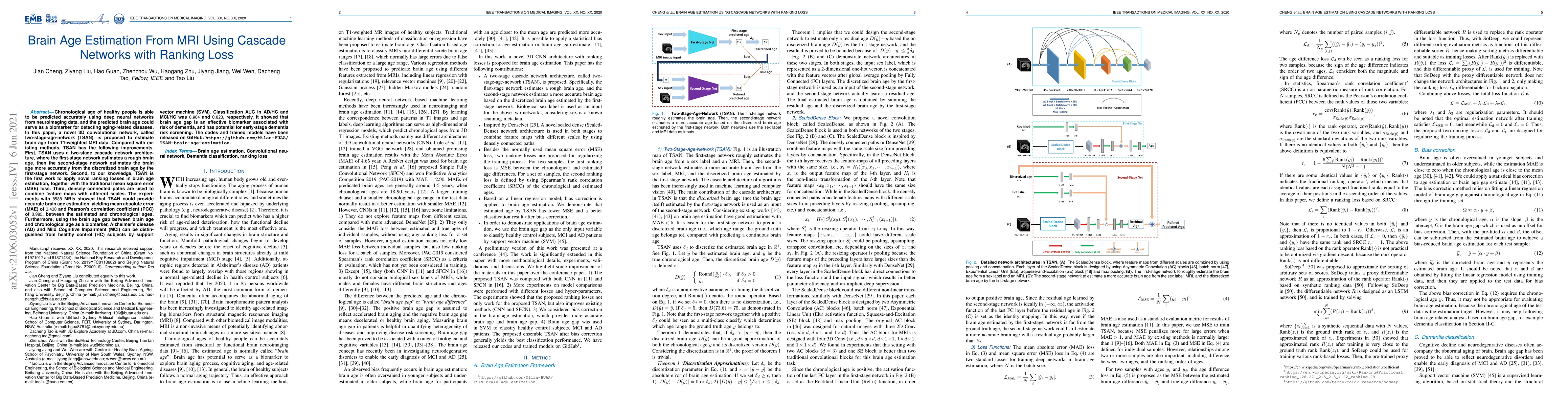 This paper proposes a novel 3D convolutional network, TSAN, for accurate brain age estimation from MRI data using a two-stage cascade architecture and ranking losses. The method shows high accuracy and potential as a biomarker for detecting dementia, distinguishing Alzheimer's disease and Mild Cognitive Impairment from healthy controls.