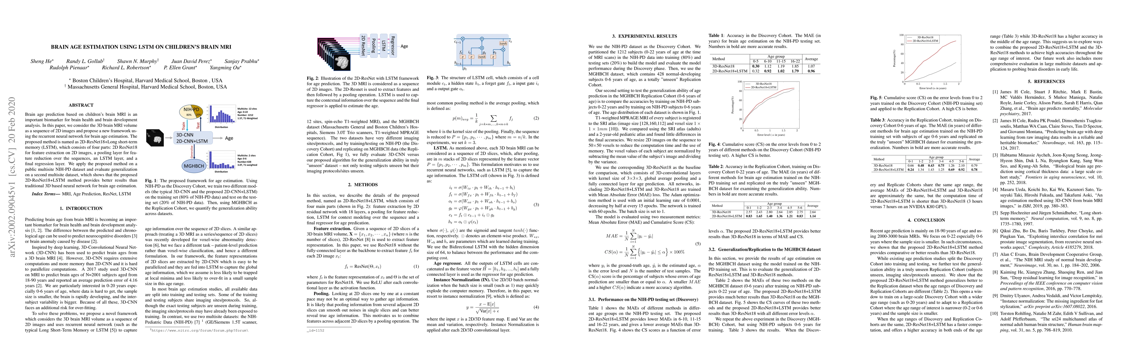 This paper proposes a 2D-ResNet18+LSTM framework for estimating brain age from children's MRI scans, outperforming traditional 3D neural networks. The method extracts features using 2D ResNet18, reduces them via pooling, processes sequences with LSTM, and finalizes with regression, demonstrating better generalization on multisite datasets.