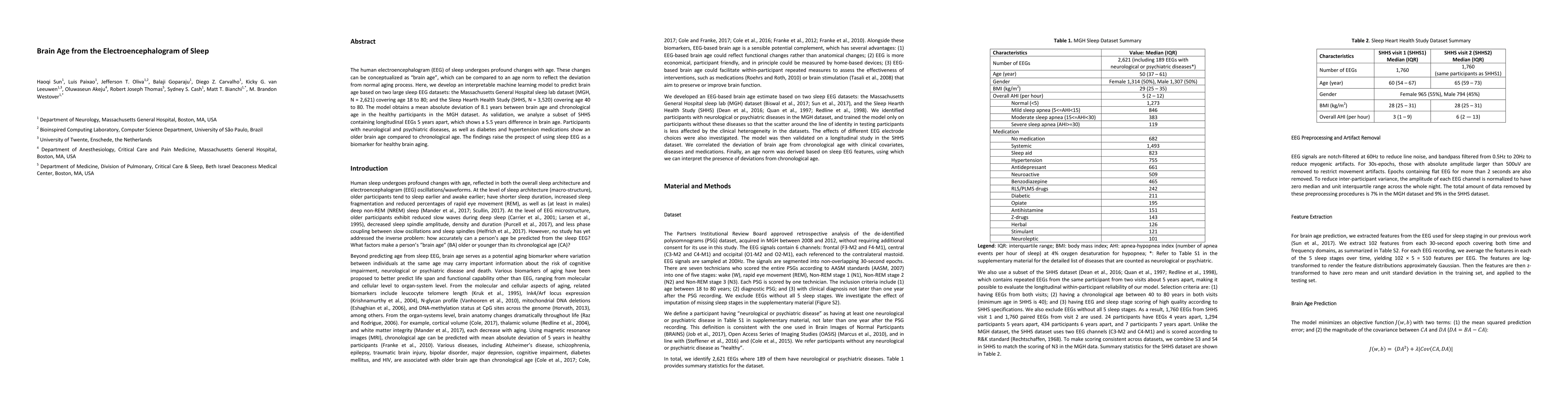 This study develops a machine learning model to predict brain age from sleep EEG data, showing a mean absolute deviation of 8.1 years in healthy participants. It identifies deviations in brain age among those with neurological and psychiatric conditions, suggesting sleep EEG as a potential biomarker for brain aging.