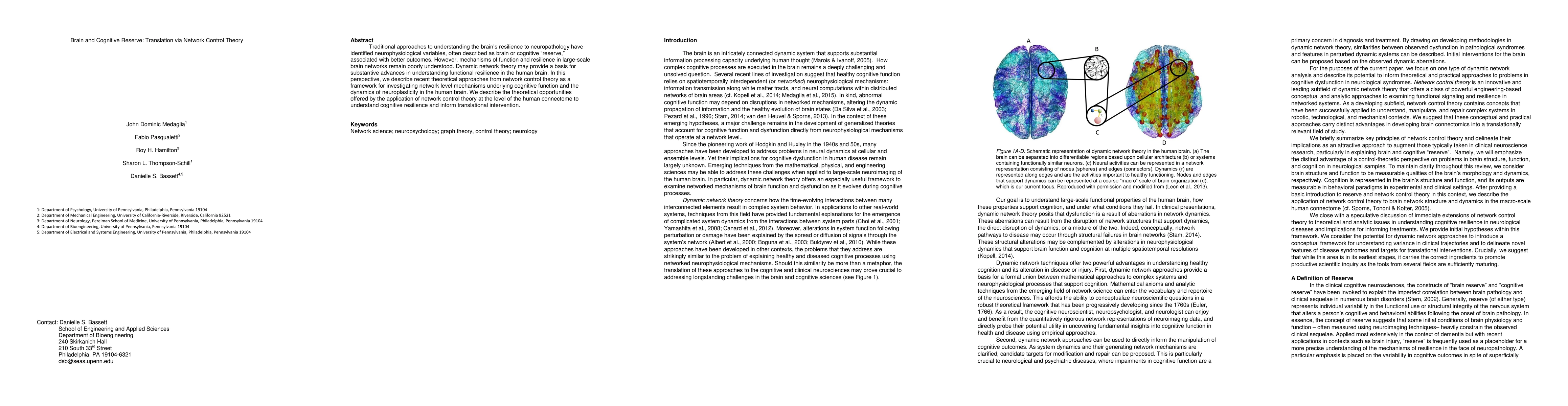 Traditional approaches to understanding the brain's resilience to neuropathology have identified neurophysiological variables, often described as brain or cognitive 'reserve,' associated with better outcomes. However, mechanisms of function and resilience in large-scale brain networks remain poorly understood. Dynamic network theory may provide a basis for substantive advances in understanding functional resilience in the human brain. In this perspective, we describe recent theoretical approaches from network control theory as a framework for investigating network level mechanisms underlying cognitive function and the dynamics of neuroplasticity in the human brain. We describe the theoretical opportunities offered by the application of network control theory at the level of the human connectome to understand cognitive resilience and inform translational intervention.