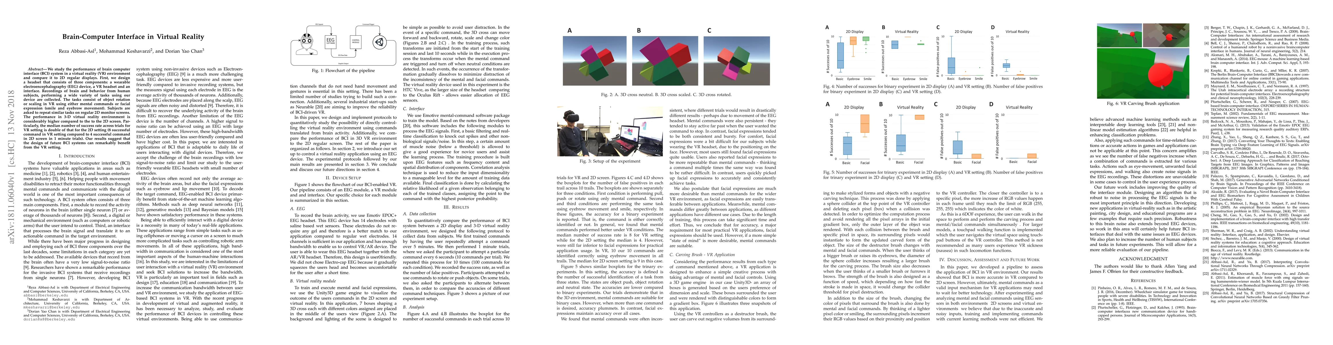 We study the performance of brain computer interface (BCI) system in a virtual reality (VR) environment and compare it to 2D regular displays. First, we design a headset that consists of three components: a wearable electroencephalography (EEG) device, a VR headset and an interface. Recordings of brain and behavior from human subjects, performing a wide variety of tasks using our device are collected. The tasks consist of object rotation or scaling in VR using either mental commands or facial expression (smile and eyebrow movement). Subjects are asked to repeat similar tasks on regular 2D monitor screens. The performance in 3-D virtual reality environment is considerably higher compared to the to the 2D screen. Particularly, the median number of success rate across trials for VR setting is double of that for the 2D setting (8 successful command in VR setting compared to 4 successful command in 2D screen in 1 minute trials). Our results suggest that the design of future BCI systems can remarkably benefit from the VR setting.
