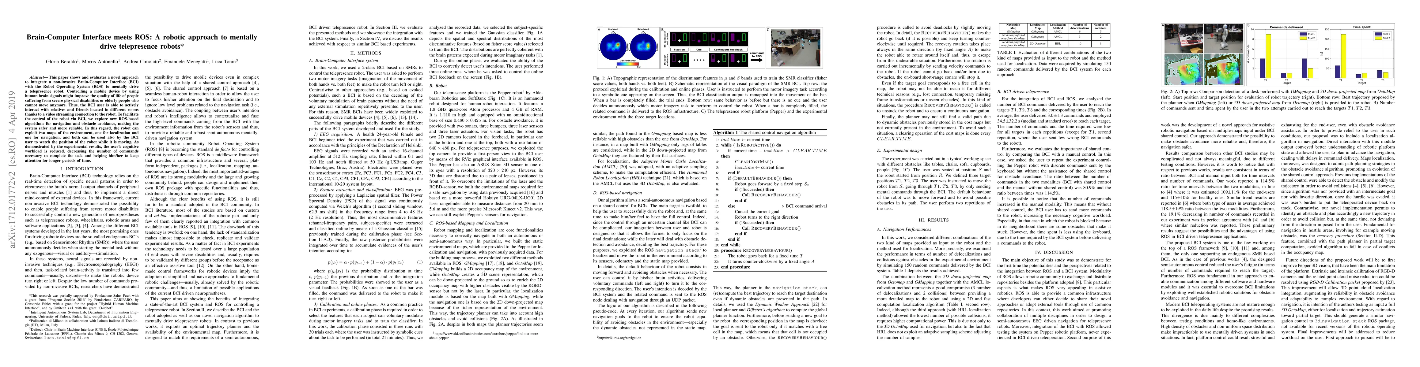 The proposed ROS-based mapping and localization methods, along with a novel shared control navigation algorithm, enhance the reliability and safety of BCI-driven telepresence robots.
