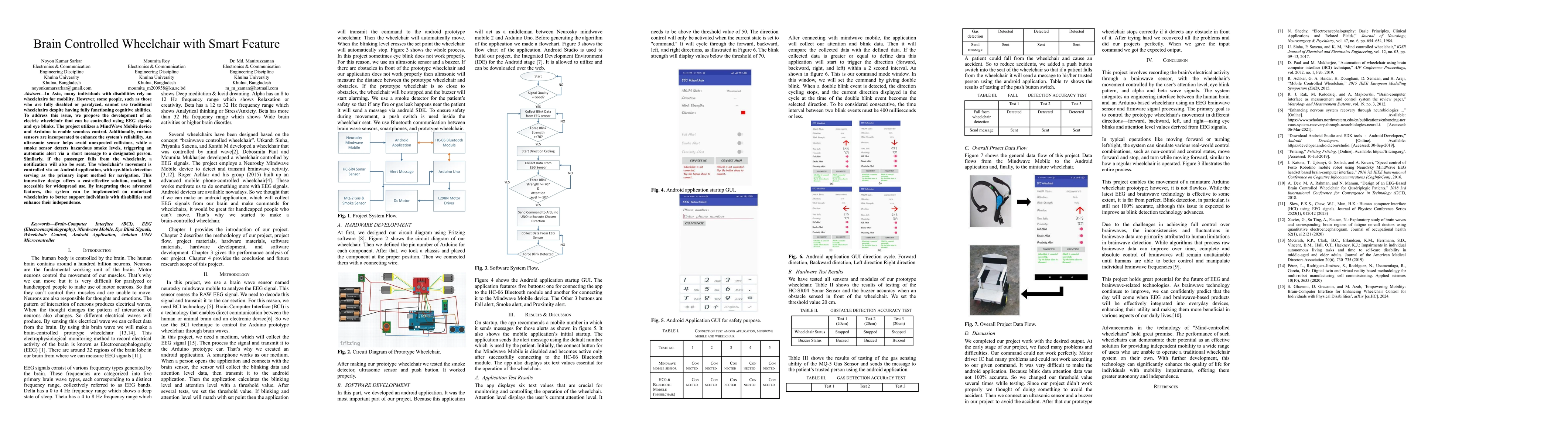 This research develops a brain-controlled wheelchair that uses EEG signals and eye blinks for navigation, aiming to assist fully disabled individuals in Asia. It integrates safety features such as collision avoidance and smoke detection, and is controlled via an Android app, offering an accessible, cost-effective solution to enhance independence.