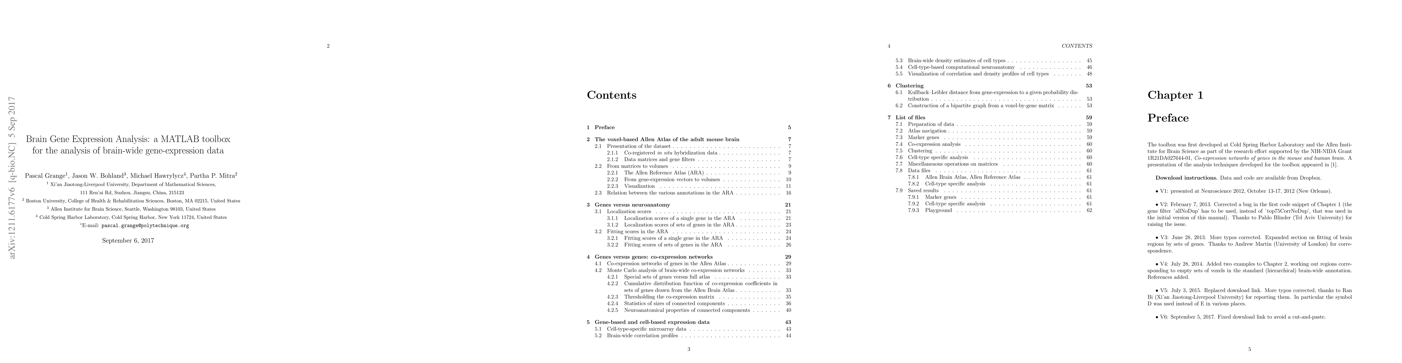 The Brain Gene Expression Analysis Toolbox facilitates the analysis of the Allen Brain Atlas's high-dimensional gene-expression data, enabling the determination of marker genes, statistical co-expression pattern analysis, and brain-wide correlation maps. It leverages MATLAB for processing the extensive volumetric data co-registered with the Allen Reference Atlas.