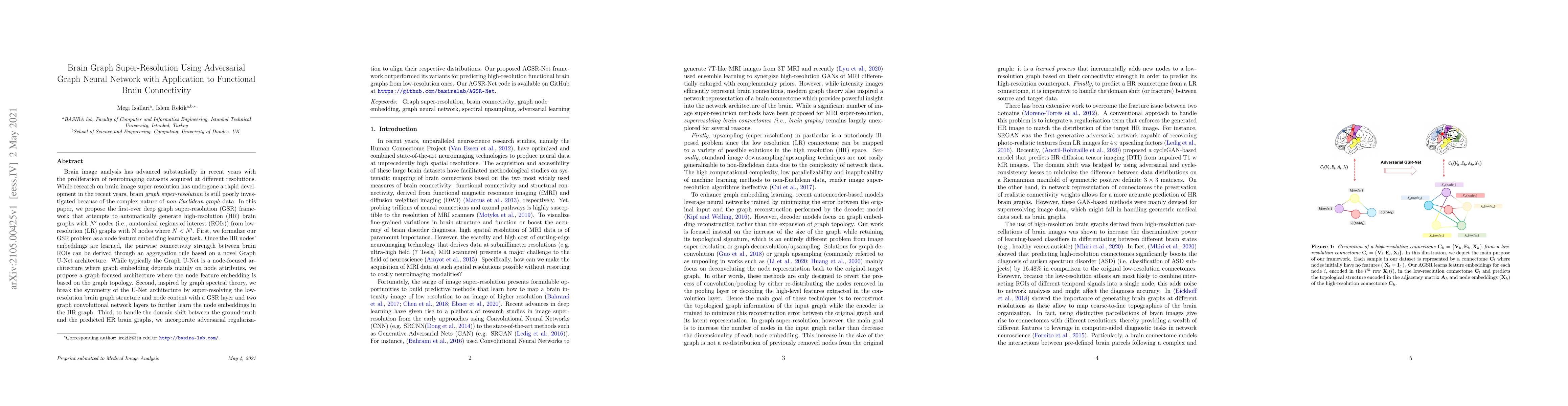 This paper proposes AGSR-Net, a deep graph super-resolution framework using adversarial graph neural networks to generate high-resolution brain graphs from low-resolution inputs. The method employs a novel Graph U-Net architecture and adversarial regularization to address the domain shift, achieving superior performance in predicting functional brain connectivity.