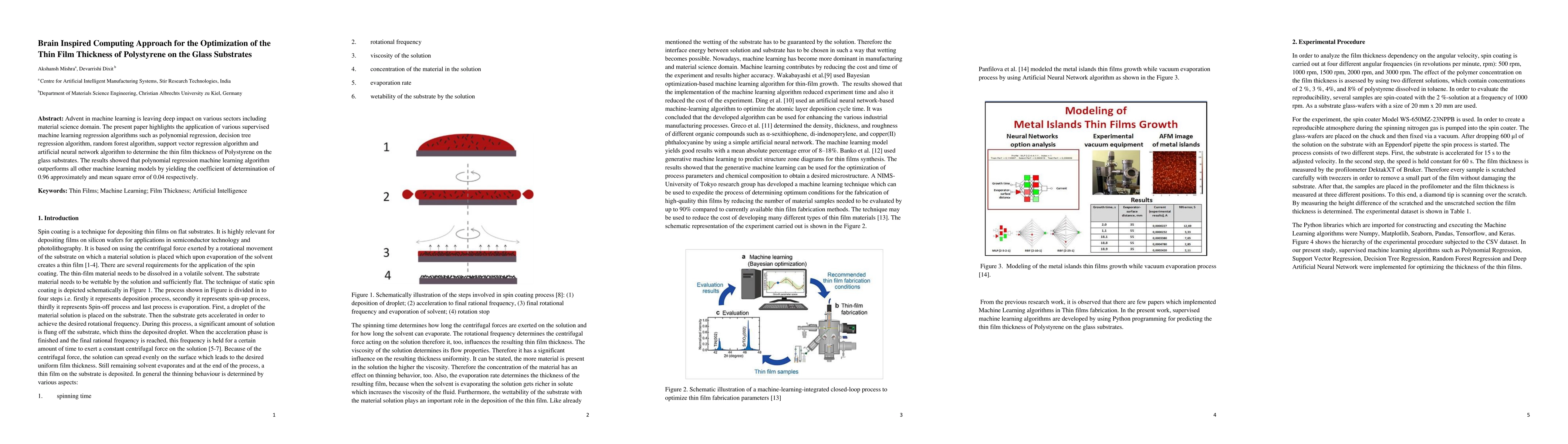 This paper explores the application of supervised machine learning regression algorithms to optimize the thin film thickness of Polystyrene on glass substrates. Polynomial regression emerged as the most effective model, achieving a coefficient of determination of approximately 0.96 and a mean square error of 0.04.