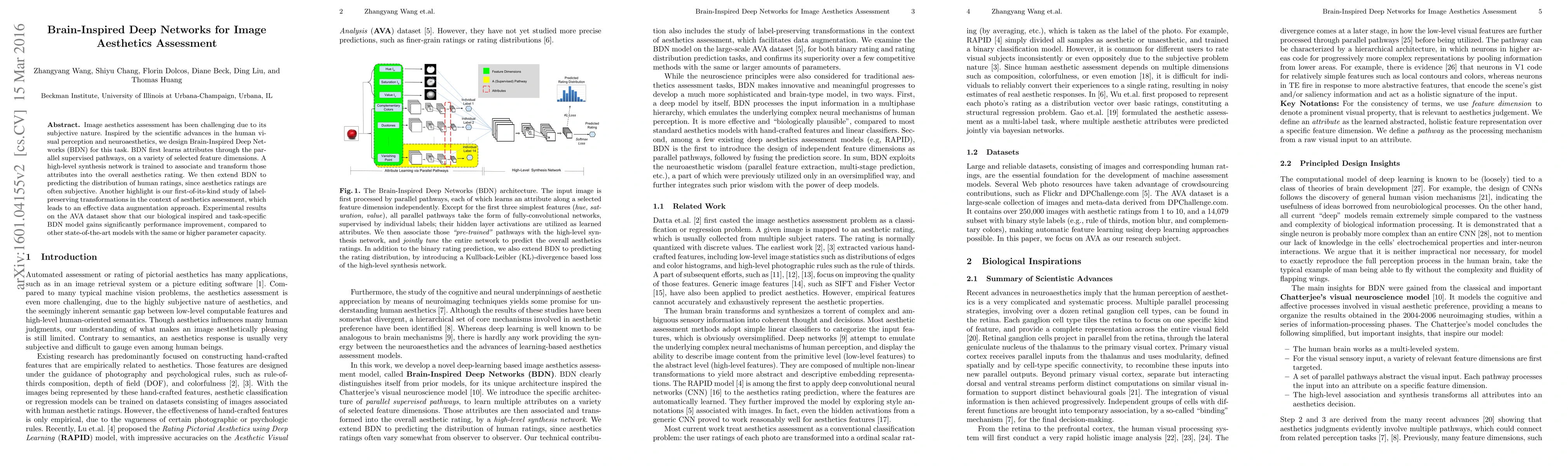 This paper proposes Brain-Inspired Deep Networks (BDN) for assessing image aesthetics, leveraging human visual perception principles. BDN learns attributes through parallel pathways and synthesizes them for overall aesthetics rating, showing improved performance on the AVA dataset compared to state-of-the-art models.