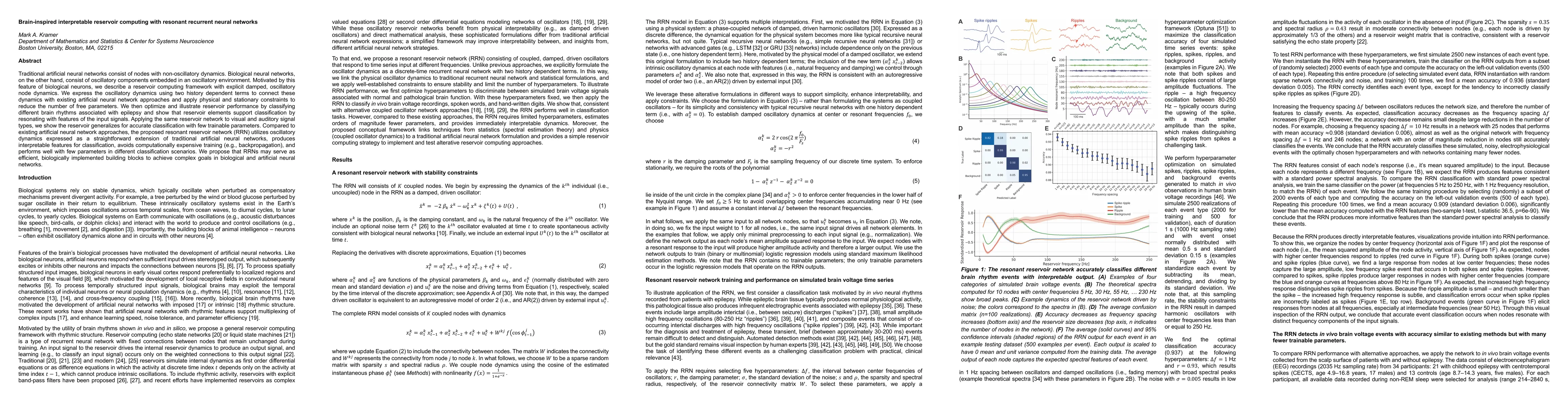 Traditional artificial neural networks consist of nodes with non-oscillatory dynamics. Biological neural networks, on the other hand, consist of oscillatory components embedded in an oscillatory environment. Motivated by this feature of biological neurons, we describe a reservoir computing framework with explicit damped, oscillatory node dynamics. We express the oscillatory dynamics using two history dependent terms to connect these dynamics with existing artificial neural network approaches and apply physical and stationary constraints to reduce the number of free parameters. We then optimize and illustrate reservoir performance by classifying different brain rhythms associated with epilepsy and show that reservoir elements support classification by resonating with features of the input signals. Applying the same reservoir network to visual and auditory signal types, we show the reservoir generalizes for accurate classification with few trainable parameters. Compared to existing artificial neural network approaches, the proposed resonant reservoir network (RRN) utilizes oscillatory dynamics expressed as a straightforward extension of traditional artificial neural networks, produces interpretable features for classification, avoids computationally expensive training (e.g., backpropagation), and performs well with few parameters in different classification scenarios. We propose that RRNs may serve as efficient, biologically implemented building blocks to achieve complex goals in biological and artificial neural networks.