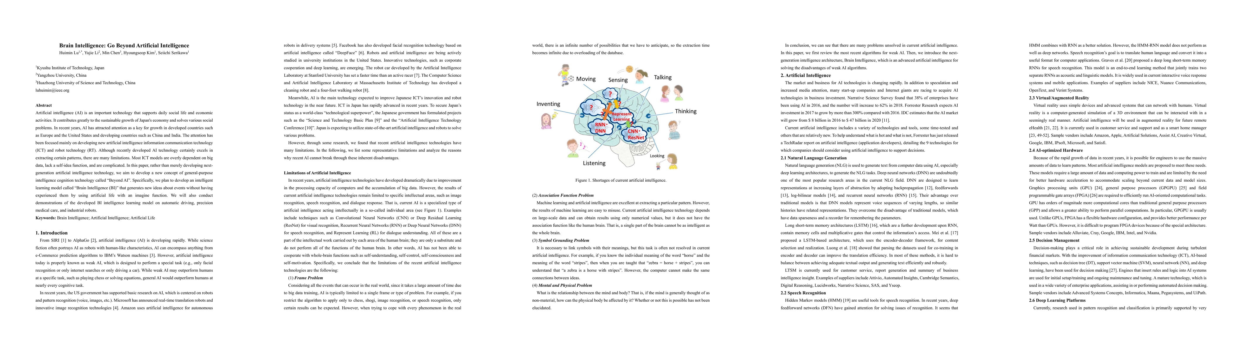 Artificial intelligence (AI) is an important technology that supports daily social life and economic activities. It contributes greatly to the sustainable growth of Japan's economy and solves various social problems. In recent years, AI has attracted attention as a key for growth in developed countries such as Europe and the United States and developing countries such as China and India. The attention has been focused mainly on developing new artificial intelligence information communication technology (ICT) and robot technology (RT). Although recently developed AI technology certainly excels in extracting certain patterns, there are many limitations. Most ICT models are overly dependent on big data, lack a self-idea function, and are complicated. In this paper, rather than merely developing next-generation artificial intelligence technology, we aim to develop a new concept of general-purpose intelligence cognition technology called Beyond AI. Specifically, we plan to develop an intelligent learning model called Brain Intelligence (BI) that generates new ideas about events without having experienced them by using artificial life with an imagine function. We will also conduct demonstrations of the developed BI intelligence learning model on automatic driving, precision medical care, and industrial robots.