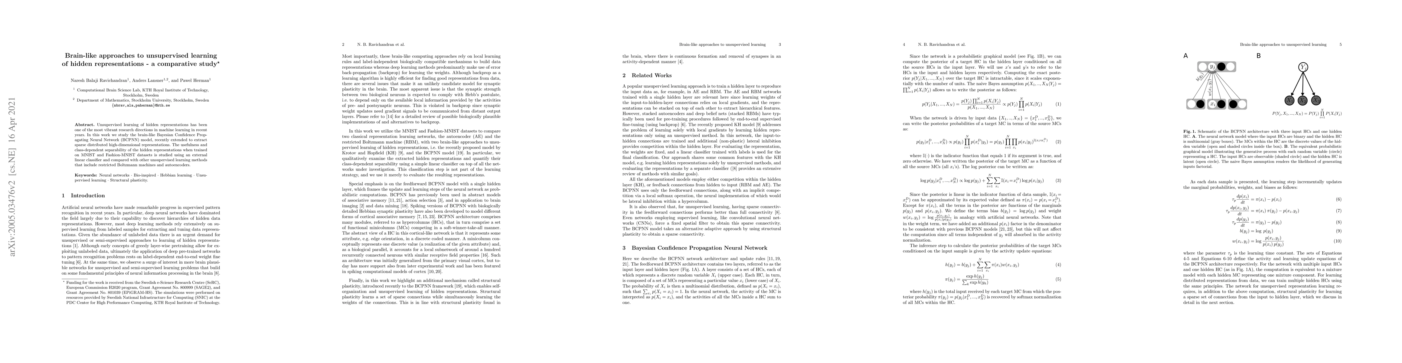 A study compares a brain-like model to other unsupervised learning methods in extracting hidden representations, finding it useful for class-dependent separation on MNIST and Fashion-MNIST datasets.