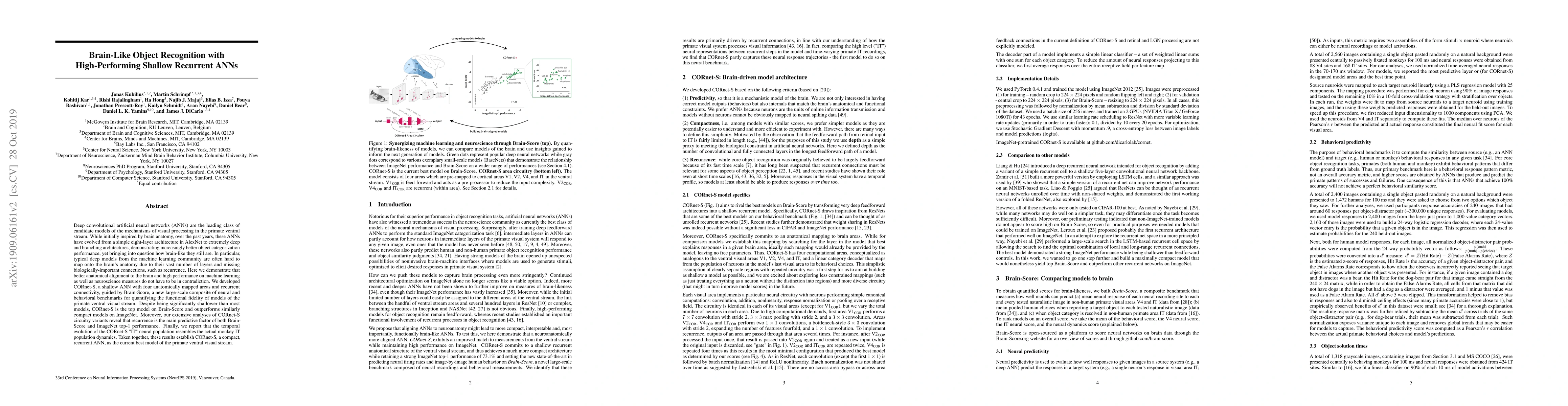 Deep convolutional artificial neural networks (ANNs) are the leading class of candidate models of the mechanisms of visual processing in the primate ventral stream. While initially inspired by brain anatomy, over the past years, these ANNs have evolved from a simple eight-layer architecture in AlexNet to extremely deep and branching architectures, demonstrating increasingly better object categorization performance, yet bringing into question how brain-like they still are. In particular, typical deep models from the machine learning community are often hard to map onto the brain's anatomy due to their vast number of layers and missing biologically-important connections, such as recurrence. Here we demonstrate that better anatomical alignment to the brain and high performance on machine learning as well as neuroscience measures do not have to be in contradiction. We developed CORnet-S, a shallow ANN with four anatomically mapped areas and recurrent connectivity, guided by Brain-Score, a new large-scale composite of neural and behavioral benchmarks for quantifying the functional fidelity of models of the primate ventral visual stream. Despite being significantly shallower than most models, CORnet-S is the top model on Brain-Score and outperforms similarly compact models on ImageNet. Moreover, our extensive analyses of CORnet-S circuitry variants reveal that recurrence is the main predictive factor of both Brain-Score and ImageNet top-1 performance. Finally, we report that the temporal evolution of the CORnet-S "IT" neural population resembles the actual monkey IT population dynamics. Taken together, these results establish CORnet-S, a compact, recurrent ANN, as the current best model of the primate ventral visual stream.