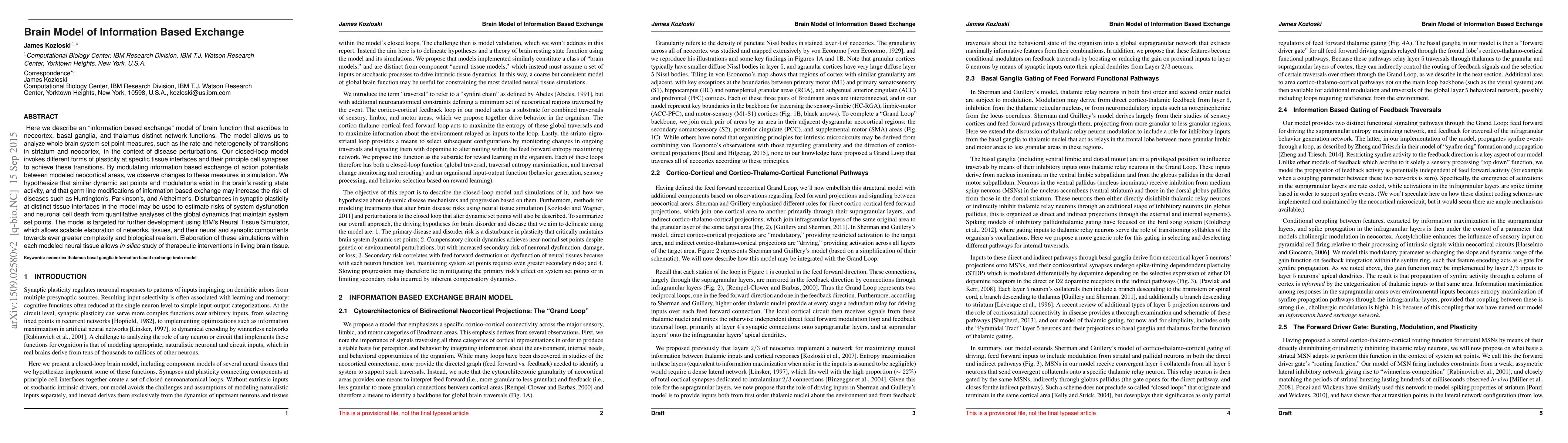 Here we describe an "information based exchange" model of brain function that ascribes to neocortex, basal ganglia, and thalamus distinct network functions. The model allows us to analyze whole brain system set point measures, such as the rate and heterogeneity of transitions in striatum and neocortex, in the context of disease perturbations. Our closed-loop model invokes different forms of plasticity at specific tissue interfaces and their principle cell synapses to achieve these transitions. By modulating information based exchange of action potentials between modeled neocortical areas, we observe changes to these measures in simulation. We hypothesize that similar dynamic set points and modulations exist in the brain's resting state activity, and that germ line modifications of information based exchange may increase the risk of diseases such as Huntington's, Parkinson's, and Alzheimer's. Disturbances in synaptic plasticity at distinct tissue interfaces in the model may be used to estimate risks of system dysfunction and neuronal cell death from quantitative analyses of the global dynamics that maintain system set points. The model is targeted for further development using IBM's Neural Tissue Simulator, which allows scalable elaboration of networks, tissues, and their neural and synaptic components towards ever greater complexity and biological realism. Elaboration of these simulations within each modeled neural tissue allows in silico study of therapeutic interventions in living brain tissue.