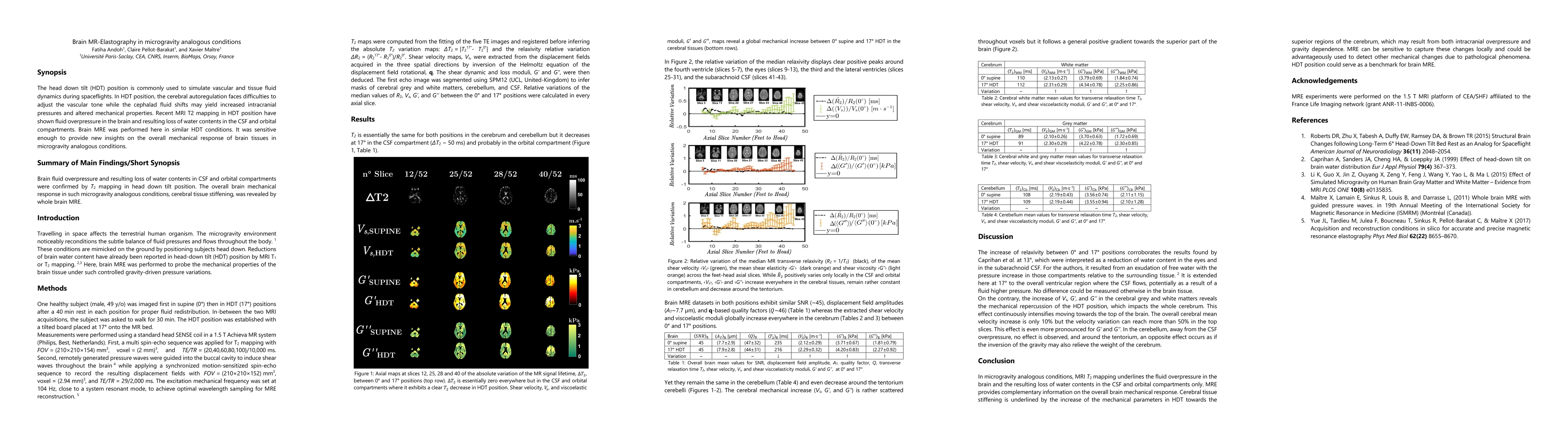 The head down tilt (HDT) position is commonly used to simulate vascular and tissue fluid dynamics during spaceflights. In HDT position, the cerebral autoregulation faces difficulties to adjust the vascular tone while the cephalad fluid shifts may yield increased intracranial pressures and altered mechanical properties. Recent MRI T2 mapping in HDT position have shown fluid overpressure in the brain and resulting loss of water contents in the CSF and orbital compartments. Brain MRE was performed here in similar HDT conditions. It was sensitive enough to provide new insights on the overall mechanical response of brain tissues in microgravity analogous conditions. Summary of Main Findings/Short Synopsis Brain fluid overpressure and resulting loss of water contents in CSF and orbital compartments were confirmed by T2 mapping in head down tilt position. The overall brain mechanical response in such microgravity analogous conditions, cerebral tissue stiffening, was revealed by whole brain MRE.