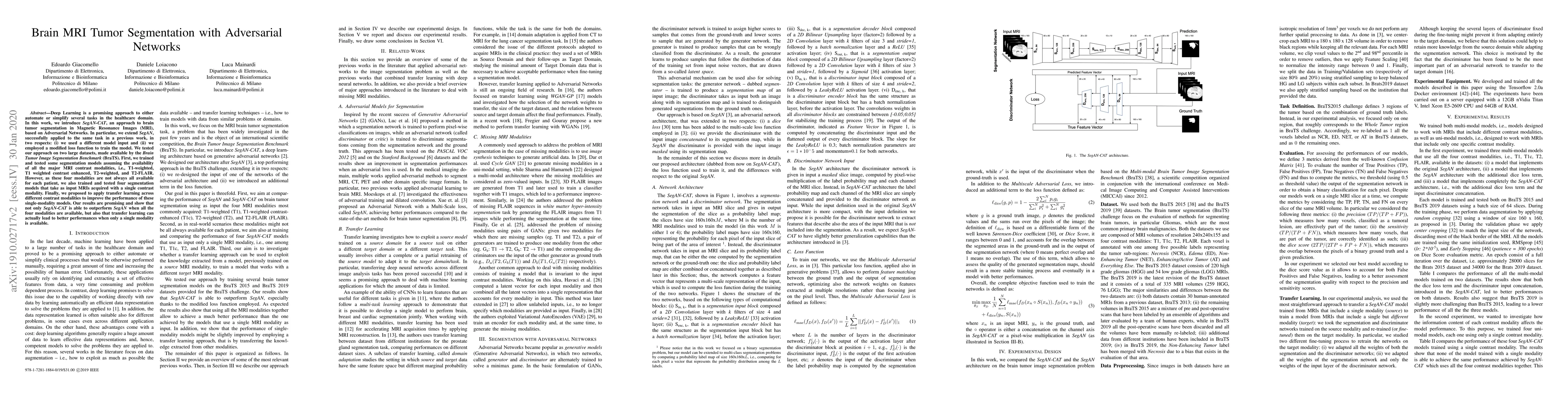 Deep Learning is a promising approach to either automate or simplify several tasks in the healthcare domain. In this work, we introduce SegAN-CAT, an approach to brain tumor segmentation in Magnetic Resonance Images (MRI), based on Adversarial Networks. In particular, we extend SegAN, successfully applied to the same task in a previous work, in two respects: (i) we used a different model input and (ii) we employed a modified loss function to train the model. We tested our approach on two large datasets, made available by the Brain Tumor Image Segmentation Benchmark (BraTS). First, we trained and tested some segmentation models assuming the availability of all the major MRI contrast modalities, i.e., T1-weighted, T1 weighted contrast-enhanced, T2-weighted, and T2-FLAIR. However, as these four modalities are not always all available for each patient, we also trained and tested four segmentation models that take as input MRIs acquired only with a single contrast modality. Finally, we proposed to apply transfer learning across different contrast modalities to improve the performance of these single-modality models. Our results are promising and show that not SegAN-CAT is able to outperform SegAN when all the four modalities are available, but also that transfer learning can actually lead to better performances when only a single modality is available.