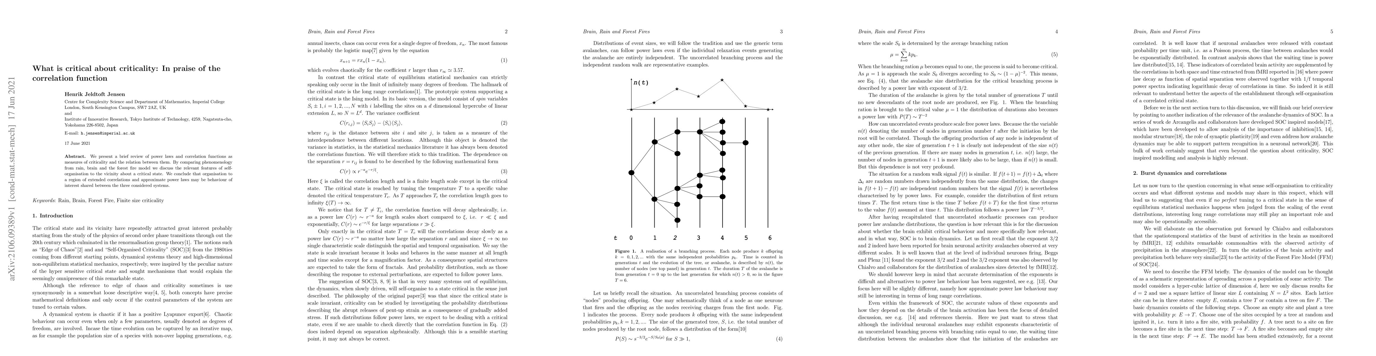 We present a brief review of power laws and correlation functions as measures of criticality and the relation between them. By comparing phenomenology from rain, brain and the forest fire model we discuss the relevant features of self-organisation to the vicinity about a critical state. We conclude that organisation to a region of extended correlations and approximate power laws may be behaviour of interest shared between the three considered systems.