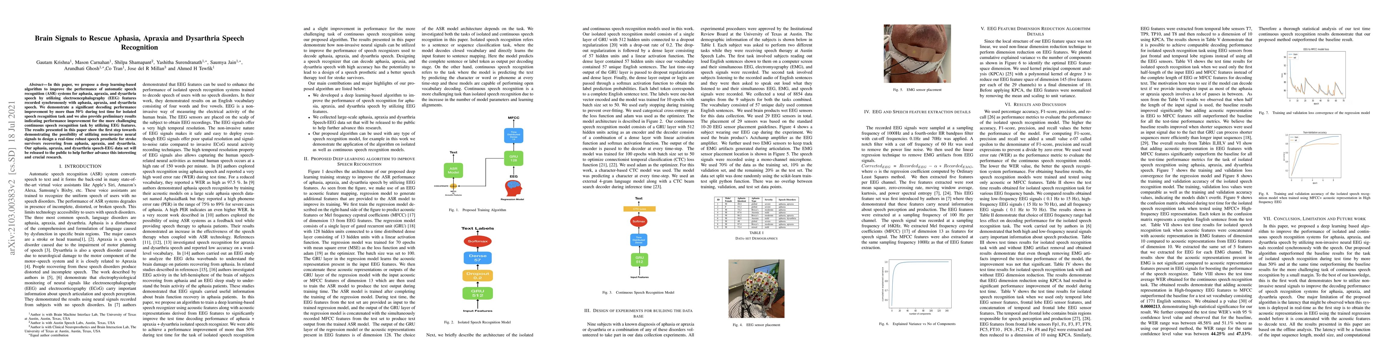 This paper proposes a deep learning algorithm that enhances automatic speech recognition for aphasia, apraxia, and dysarthria using EEG features. The method shows a 50% improvement in isolated speech recognition, with preliminary success in continuous speech recognition, marking a significant step towards developing a real-time speech prosthetic for stroke survivors.